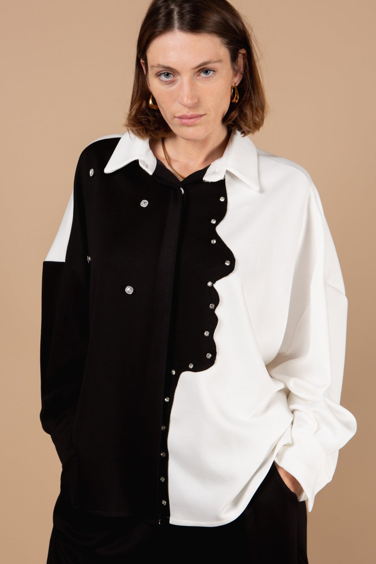 Make a statement in the Silhouette Jewelled Oversized Shirt. This unique piece features a striking two-tone design. The curving seam and added jewels elevate this from a simple shirt to a work of art. The oversized fit makes it comfortable and effortlessly cool, while the bold contrast ensures you'll stand out from the crowd.