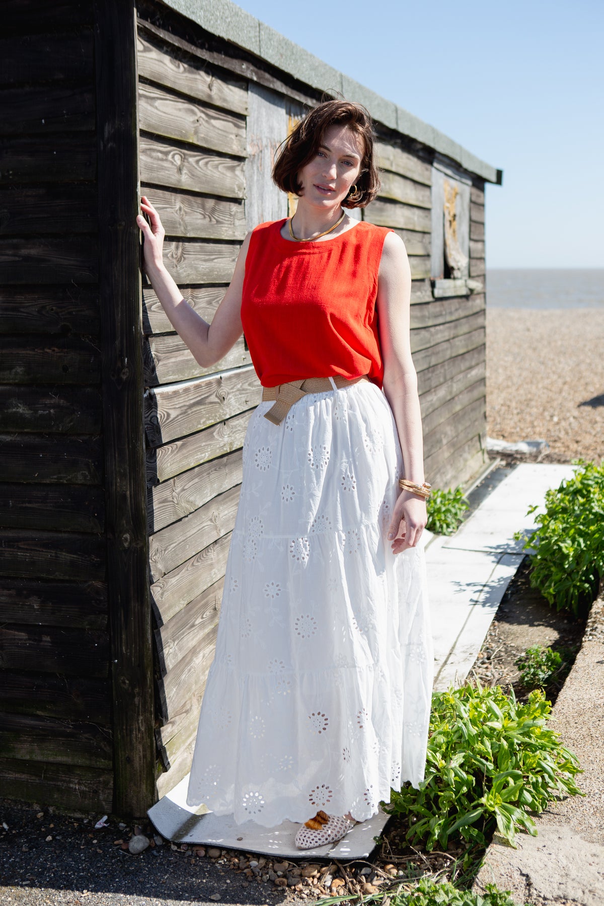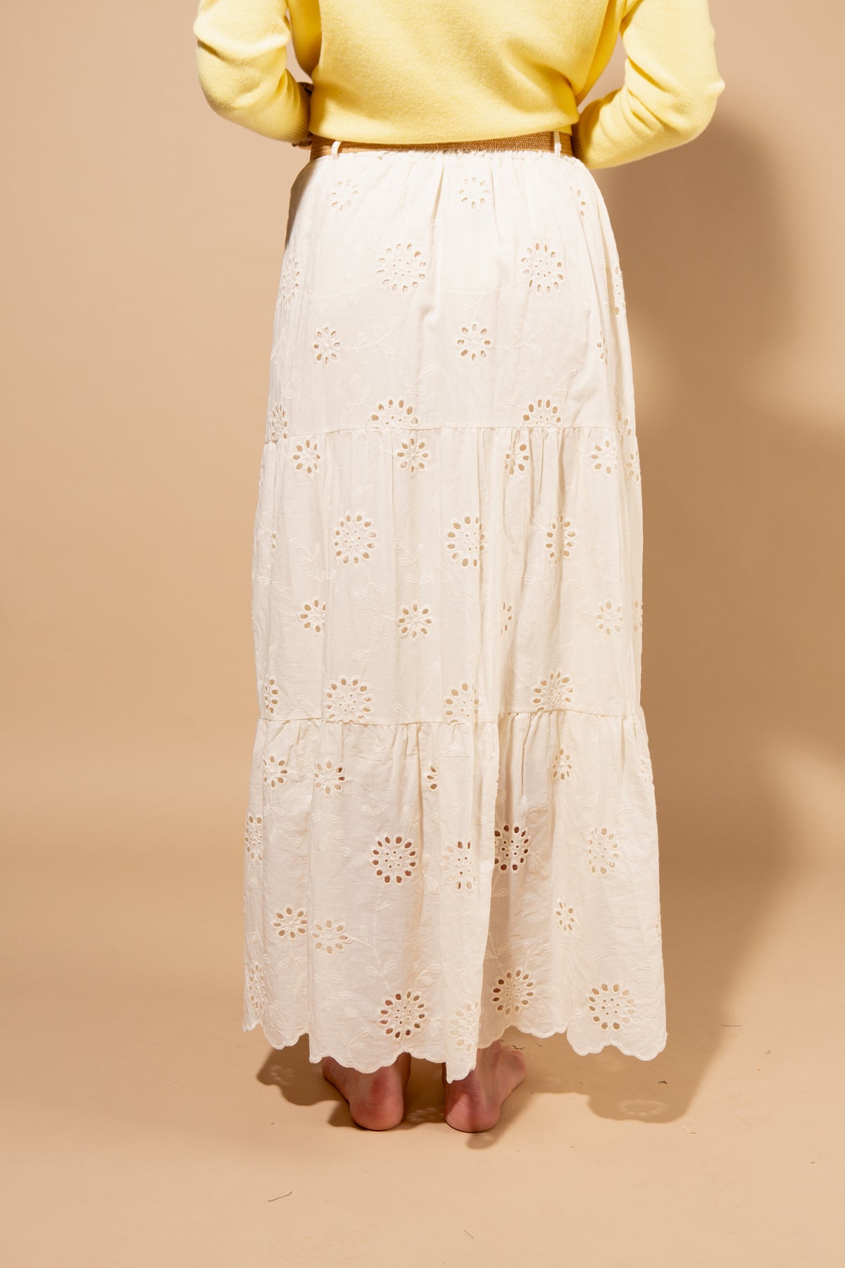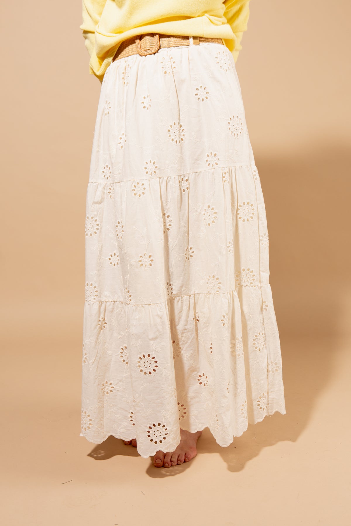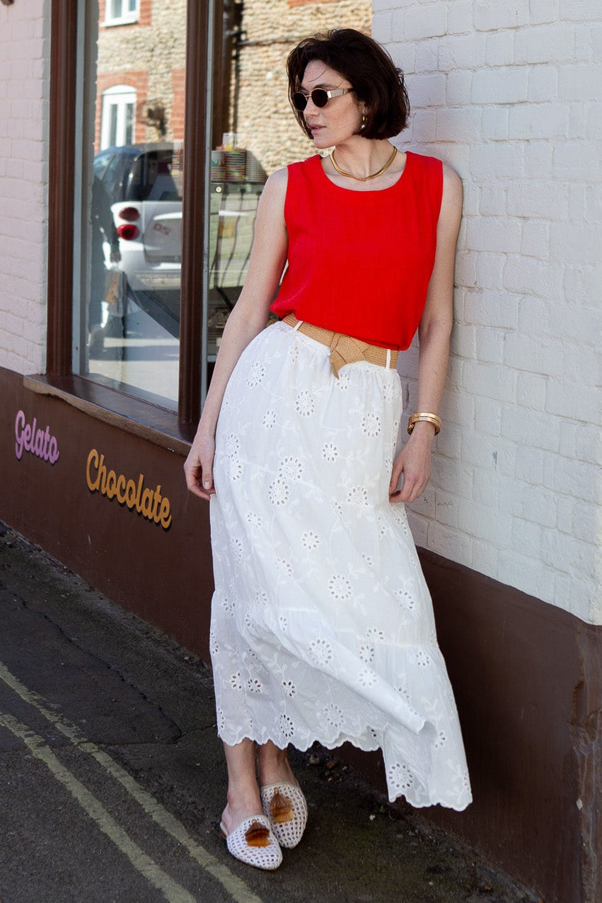 Elegant Broderie Anglaise long skirt crafted from lightweight cotton with delicate eyelet embroidery throughout. Features a flattering A-line silhouette that flows gracefully to the ankle, perfect for summer occasions and warm-weather styling. The included matching belt cinches at the waist for a defined, polished look.