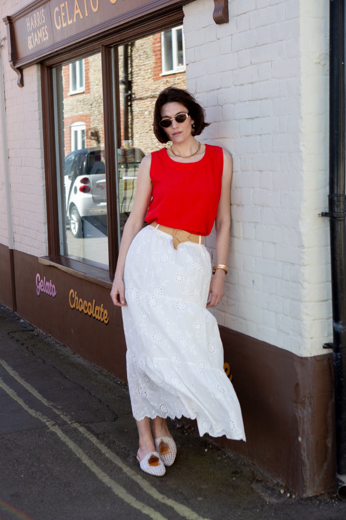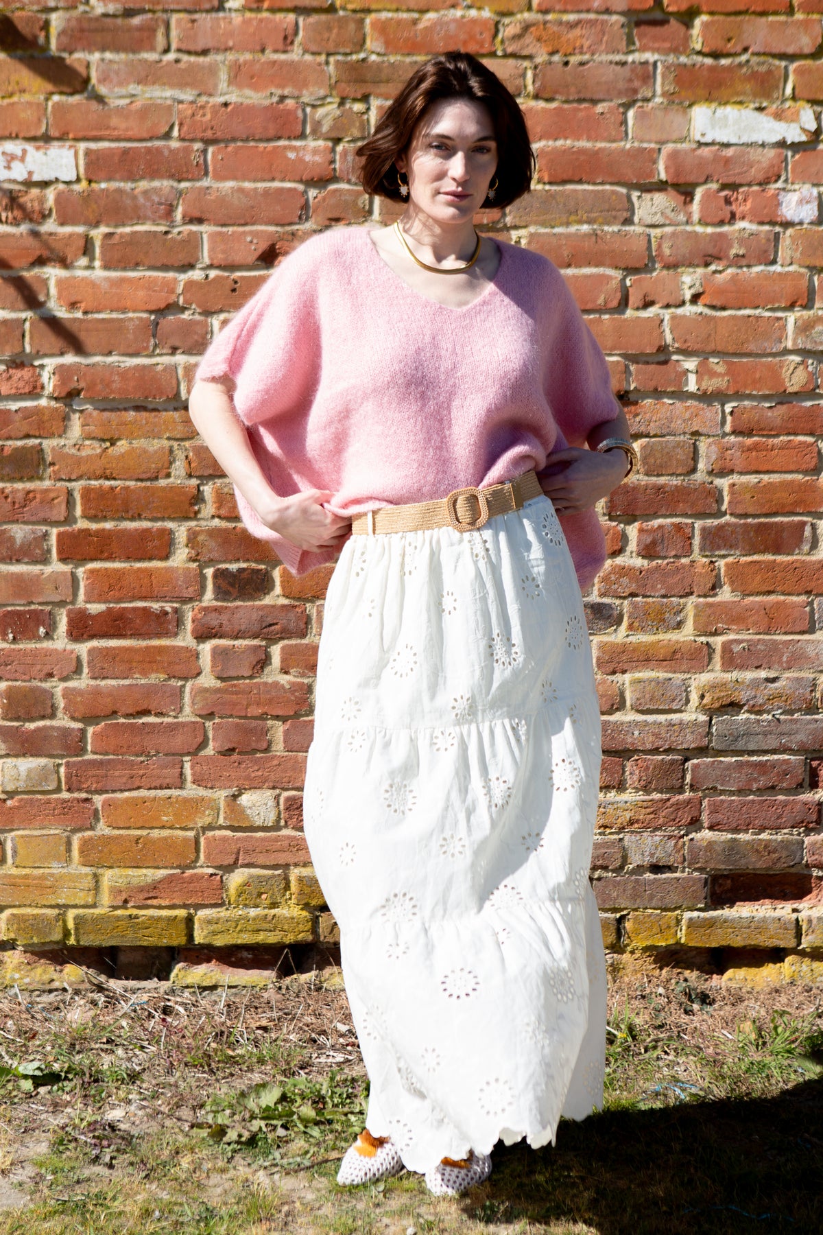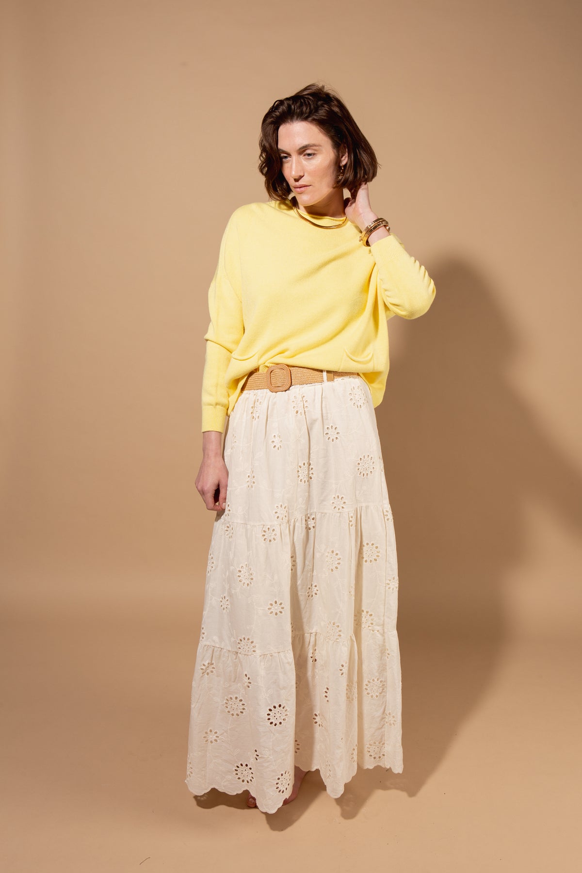 Elegant Broderie Anglaise long skirt crafted from lightweight cotton with delicate eyelet embroidery throughout. Features a flattering A-line silhouette that flows gracefully to the ankle, perfect for summer occasions and warm-weather styling. The included matching belt cinches at the waist for a defined, polished look.