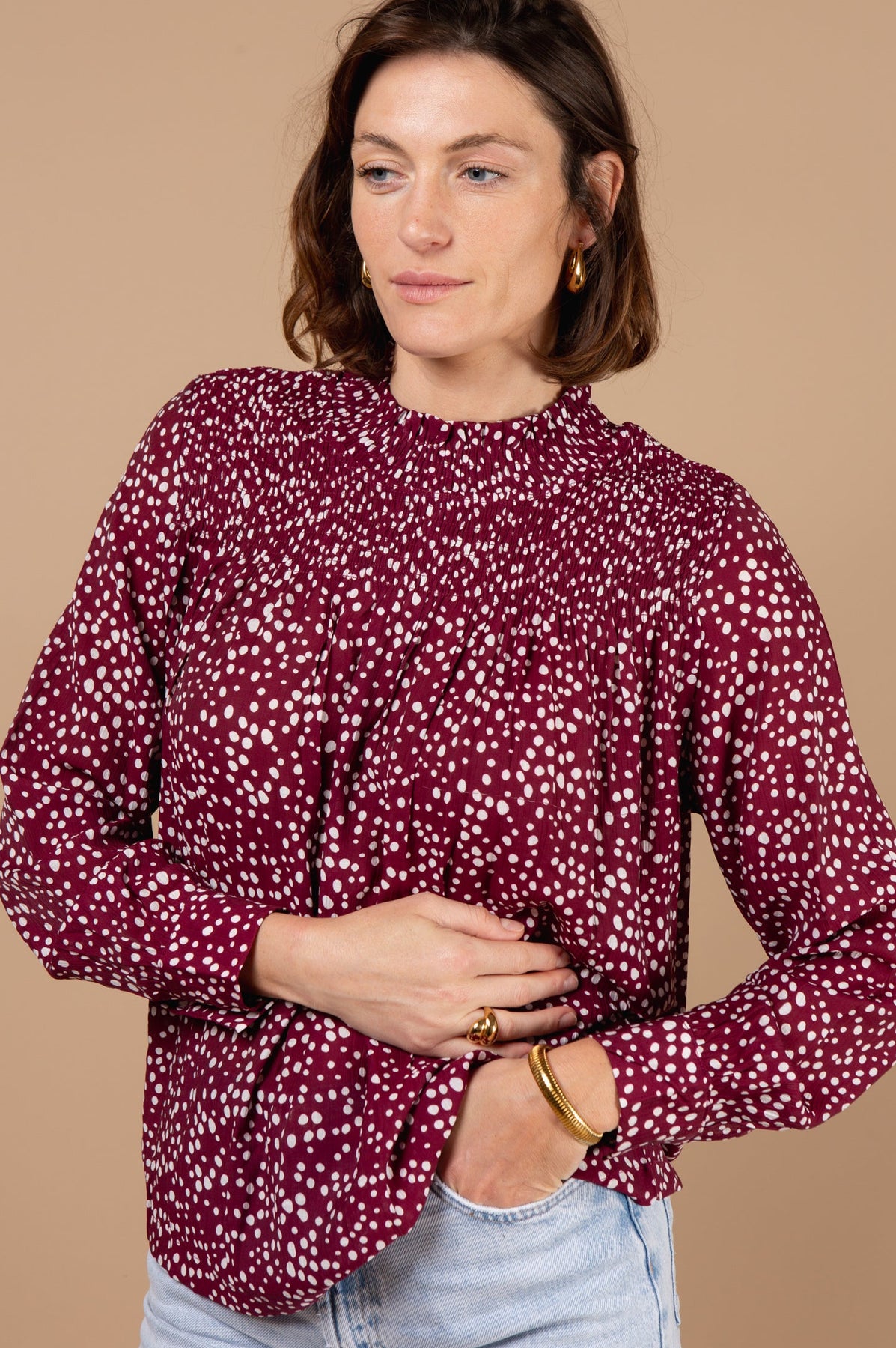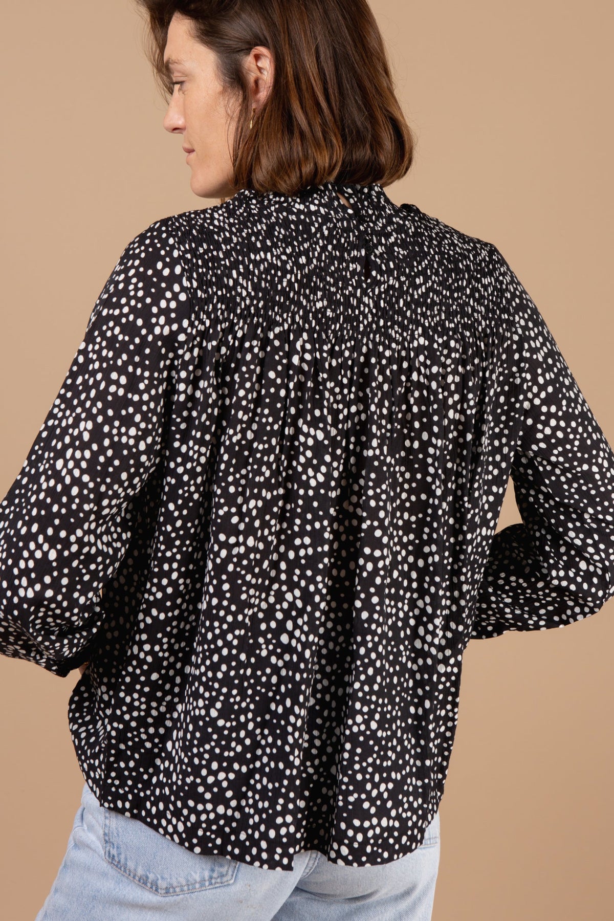 Made from a lightweight, flowing fabric, it drapes beautifully for a flattering, comfortable fit. The shirred detail on the neck and cuffs creates subtle texture and shape, making it easy to dress up or down.
