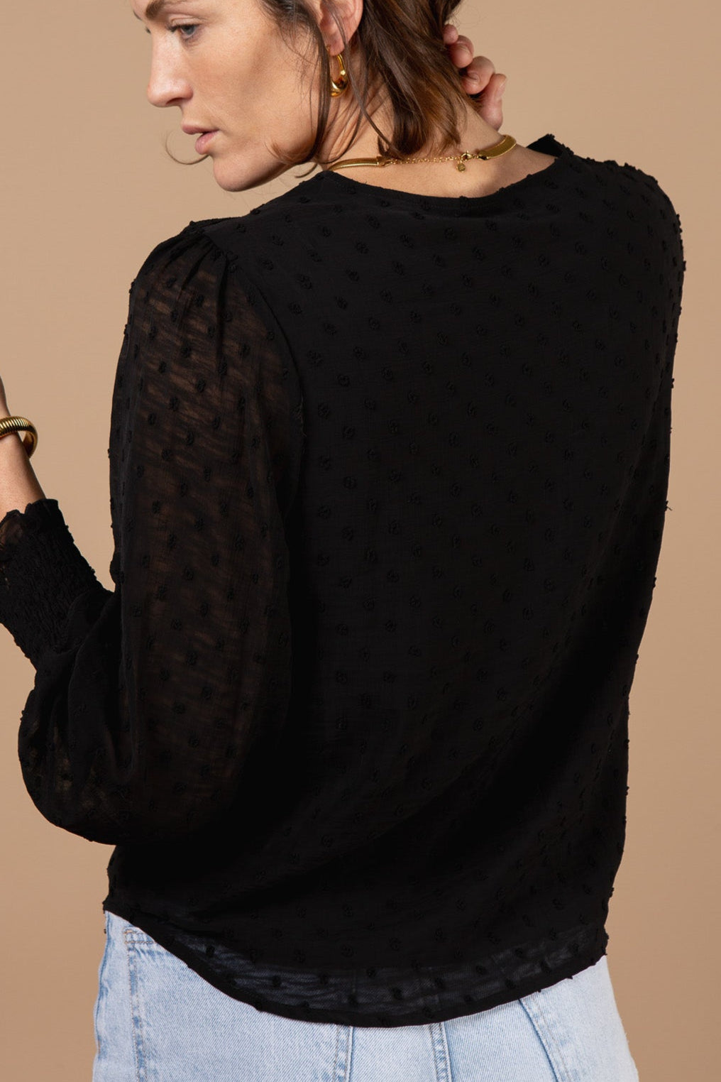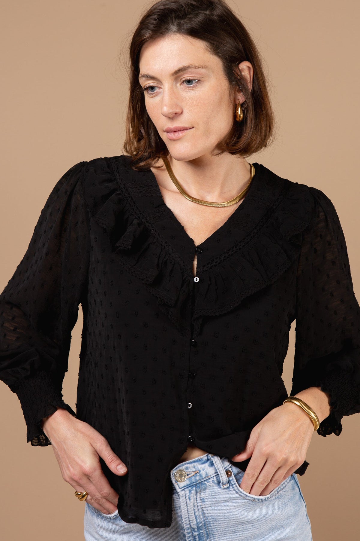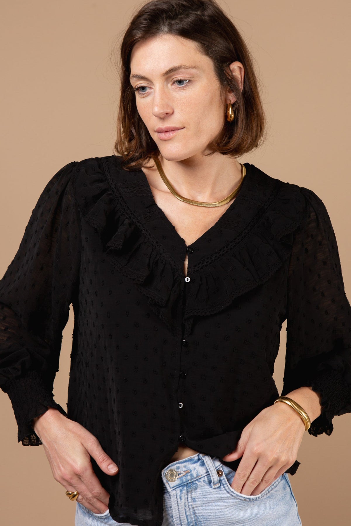 Introduce a touch of romantic elegance to your wardrobe with our Frill-Front V-Neck Blouse. This beautiful top is a study in delicate details, featuring a deep V-neckline framed by a charming frill detail that extends down the front. The subtle texture from the Swiss dot pattern adds a sophisticated flair, while the sheer, billowy sleeves with shirred cuffs provide a lightweight and comfortable feel.