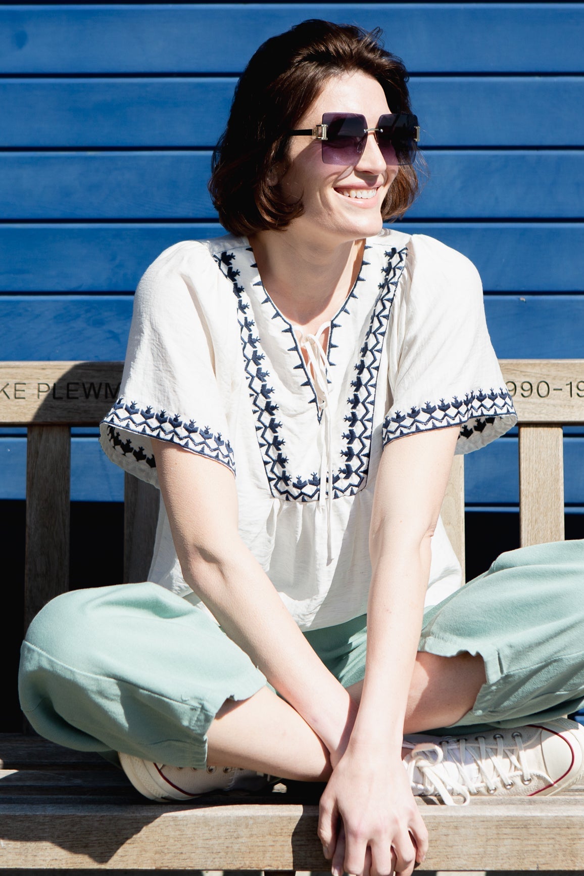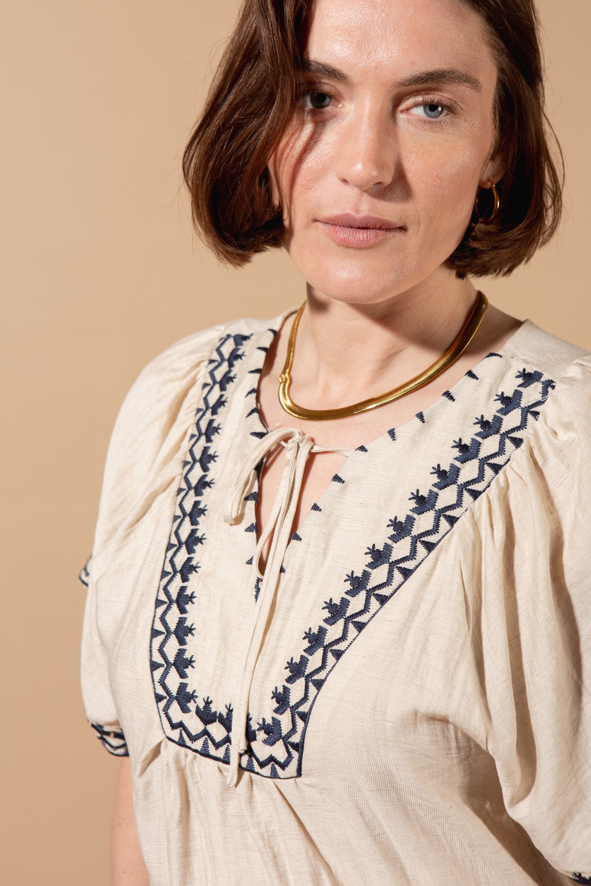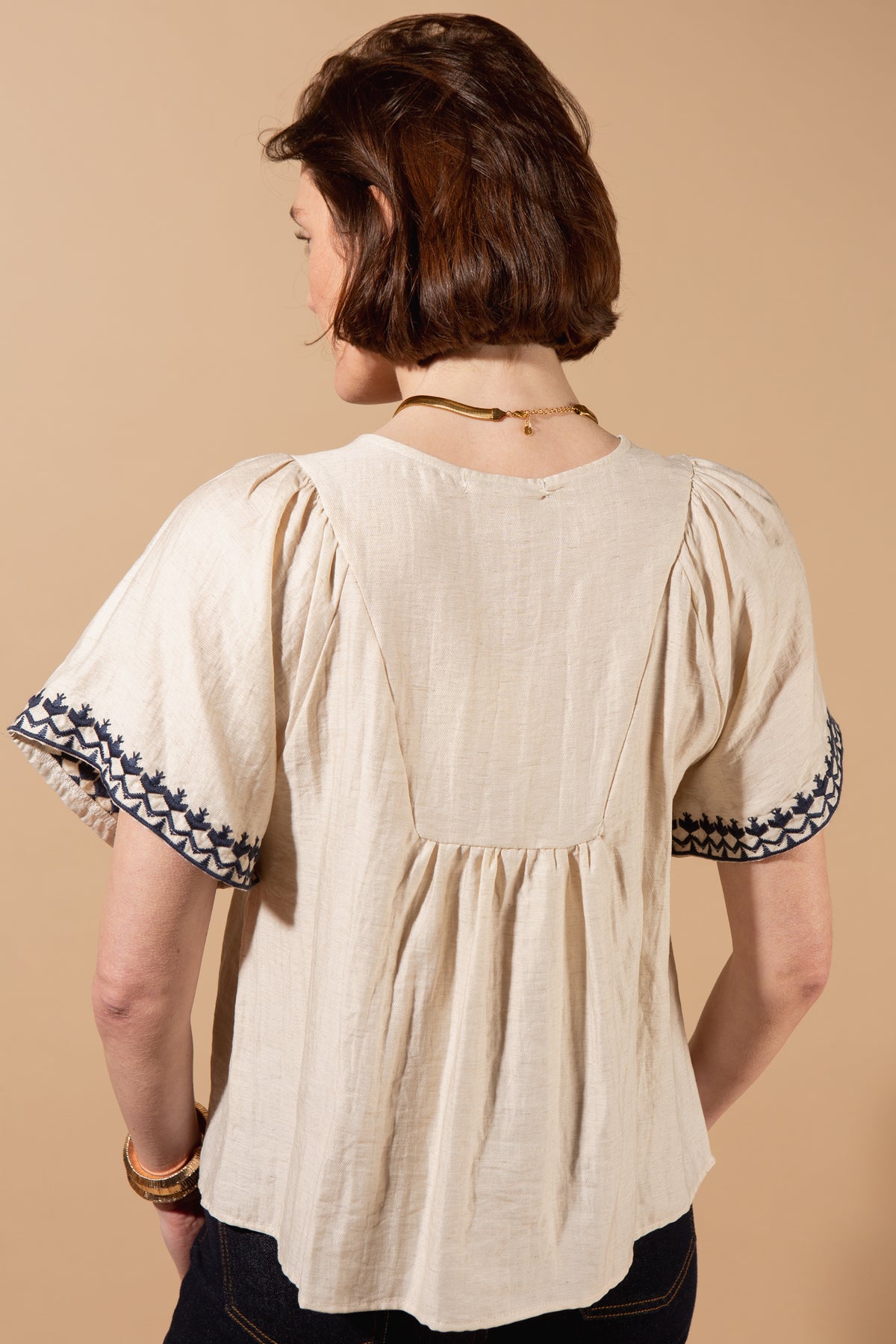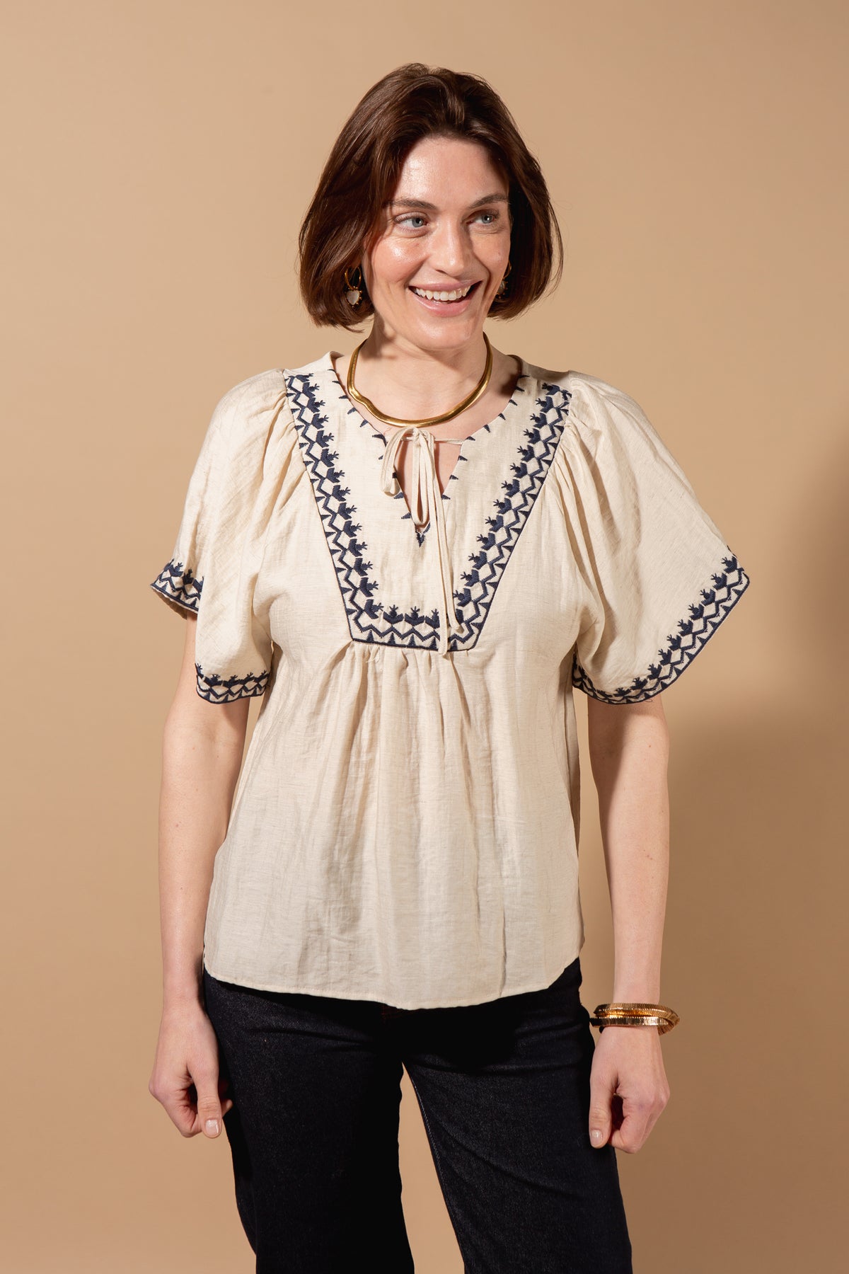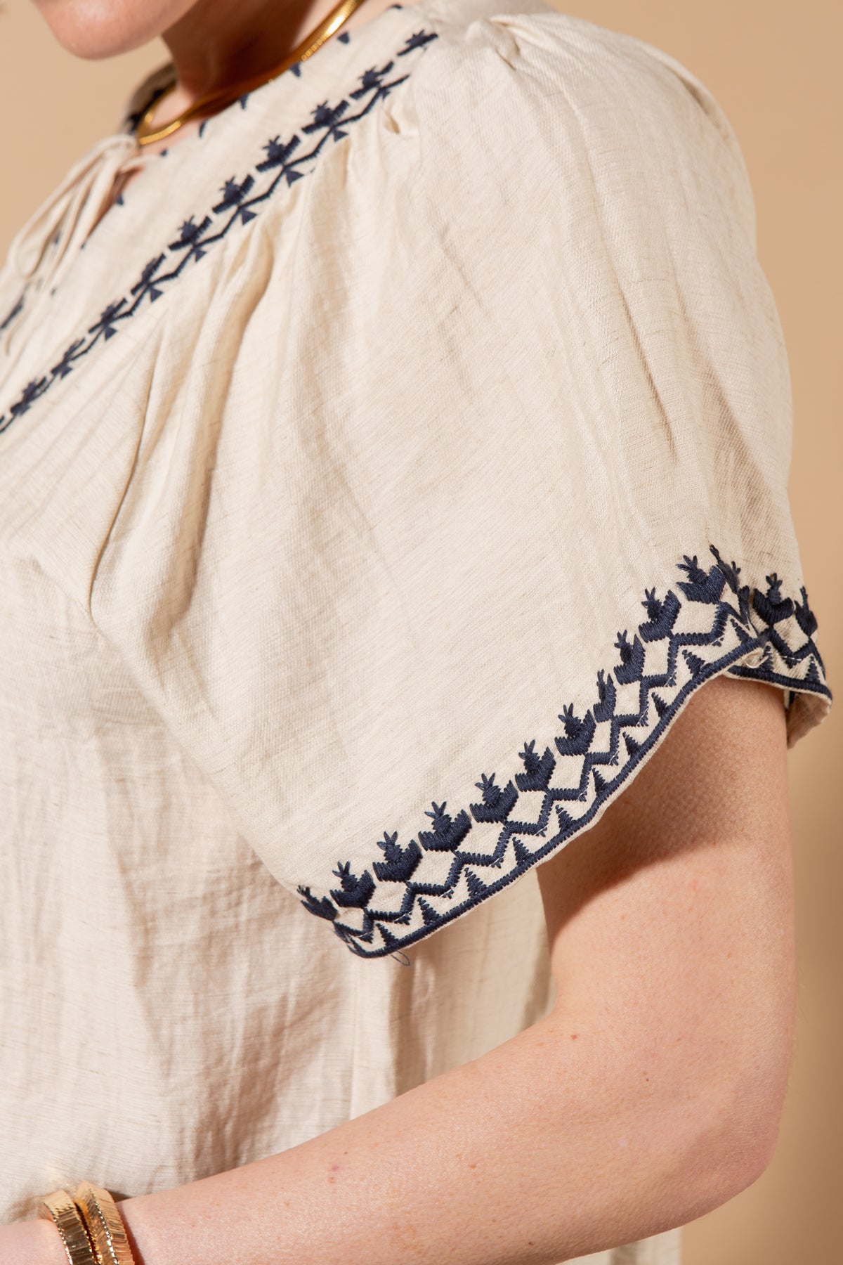 Combine natural breathability with understated charm with this linen blend top. Delicate embroidered detailing adds interest, while the relaxed, comfortable fit makes it perfect for everyday wear.