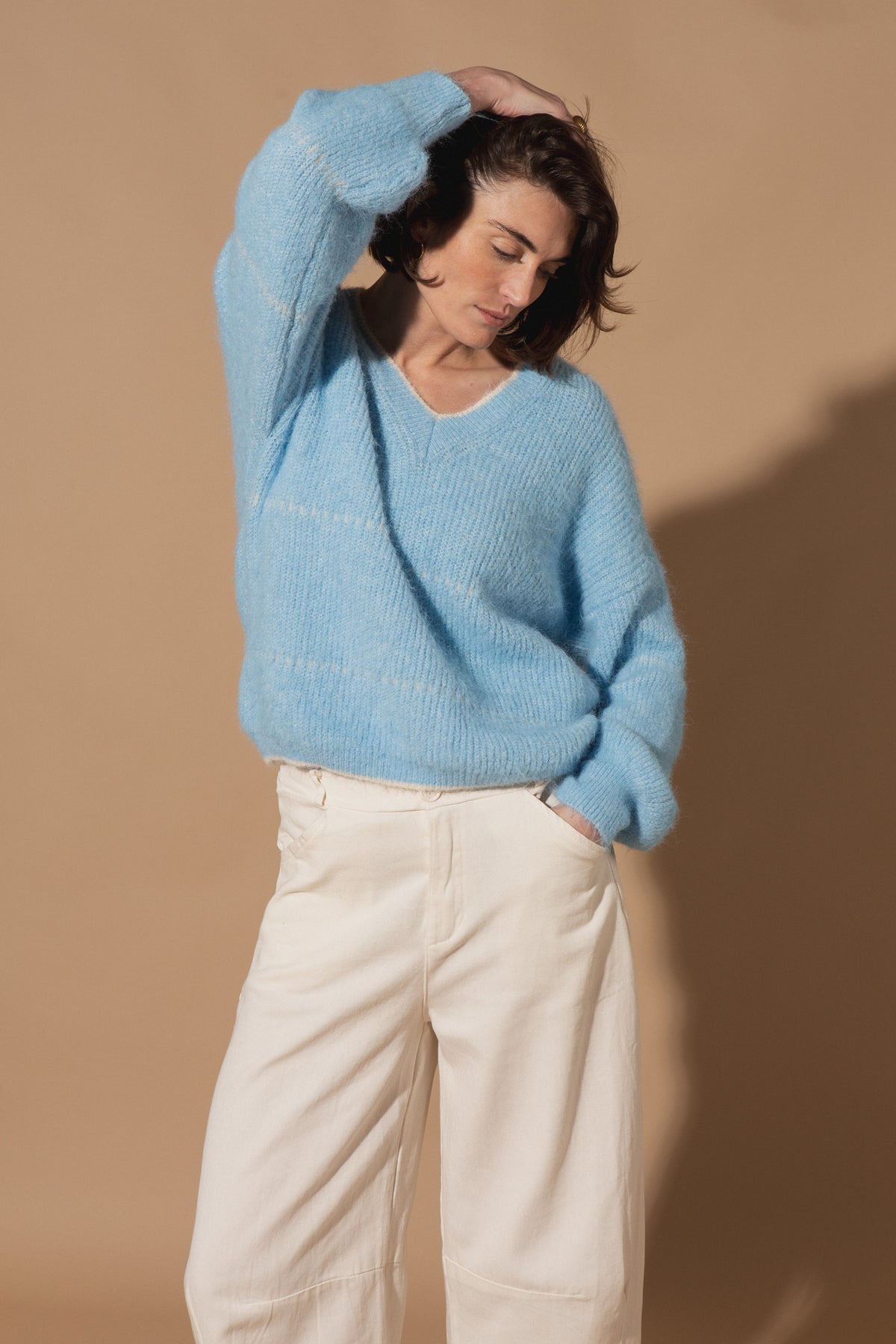 The Paolo V-Neck Jumper features a deep V-neckline, long sleeves with dropped shoulders, and ribbed detailing at the cuffs and hem in a chunky, textured knit.