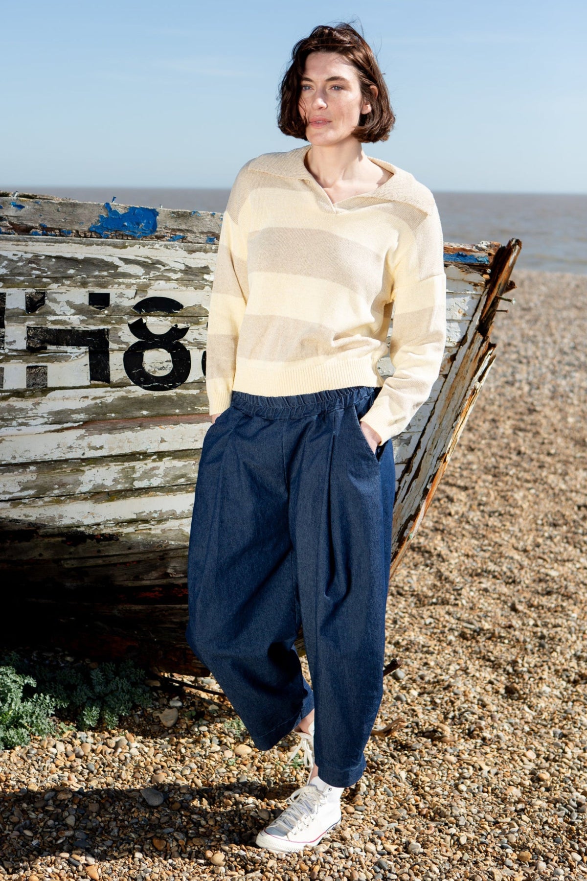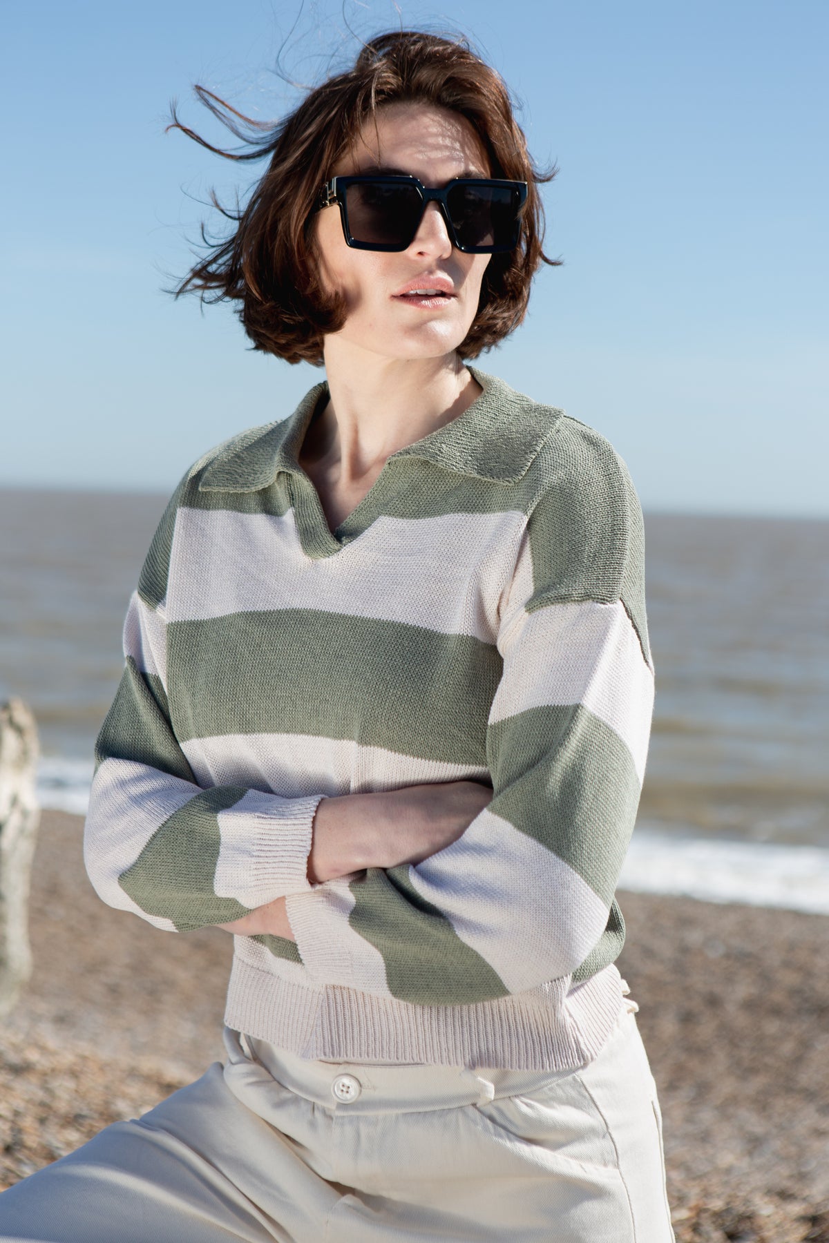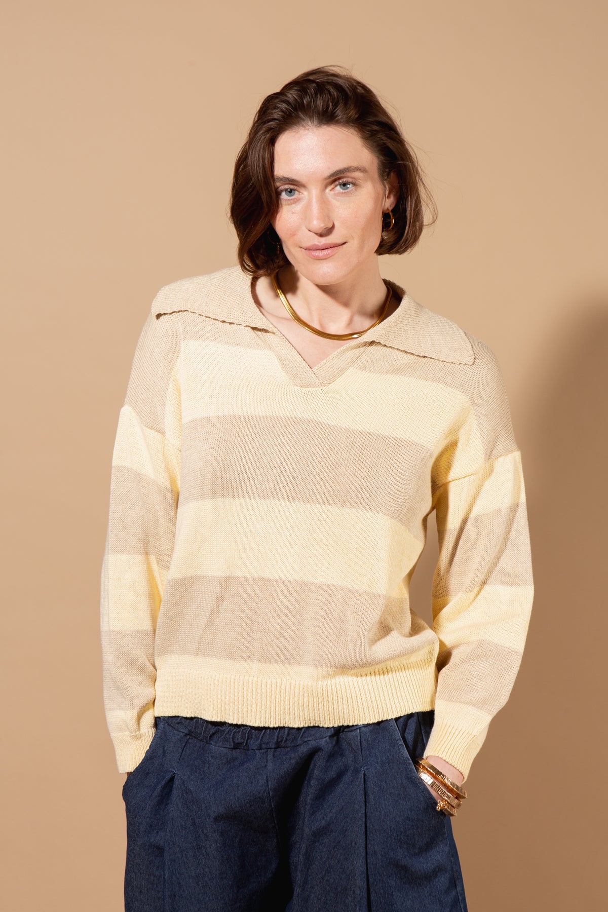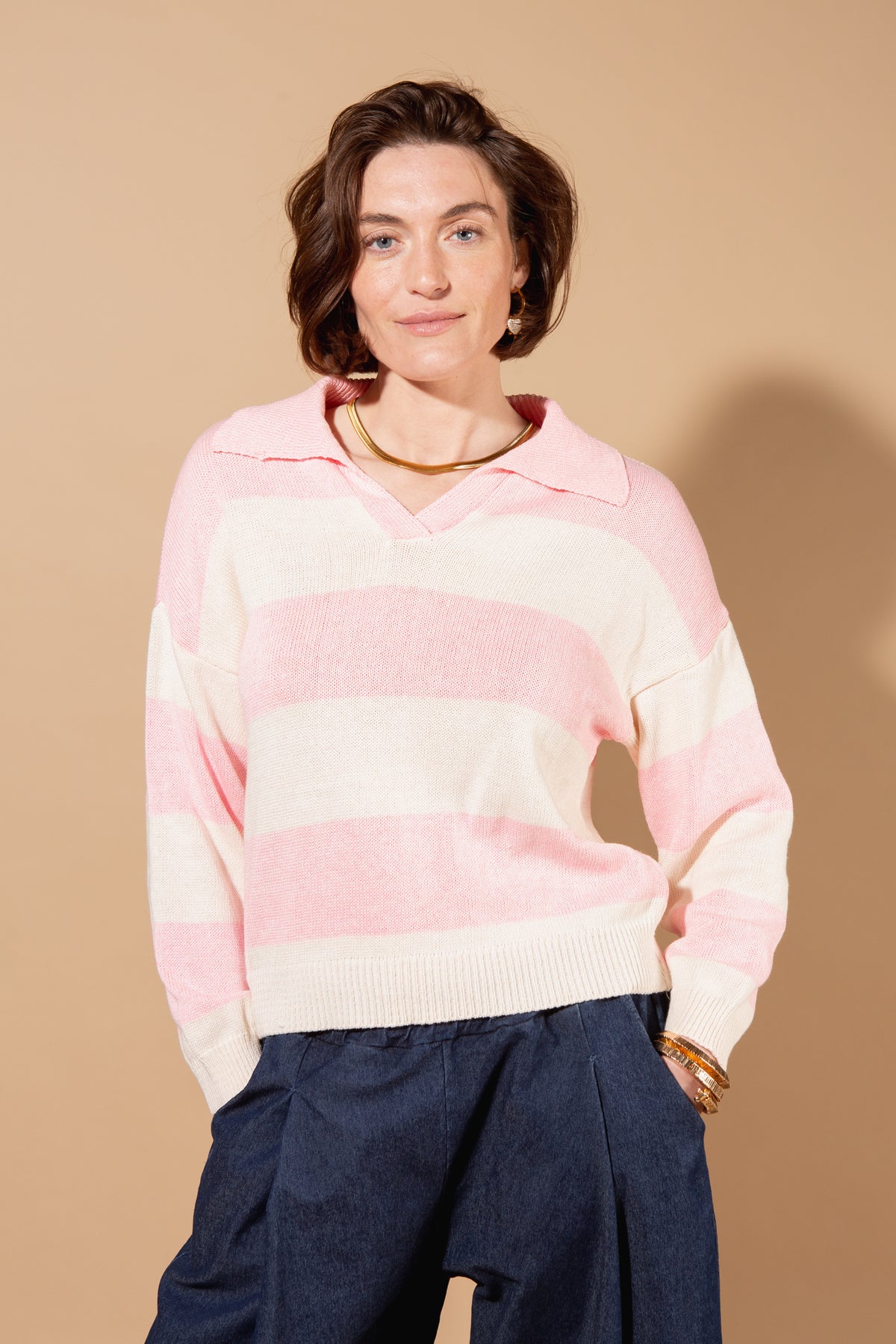 A timeless jumper featuring a distinctive striped design and collar detail. The classic design pairs effortlessly with jeans or trousers, making it a versatile addition to your wardrobe. Perfect for layering or wearing solo during milder weather.