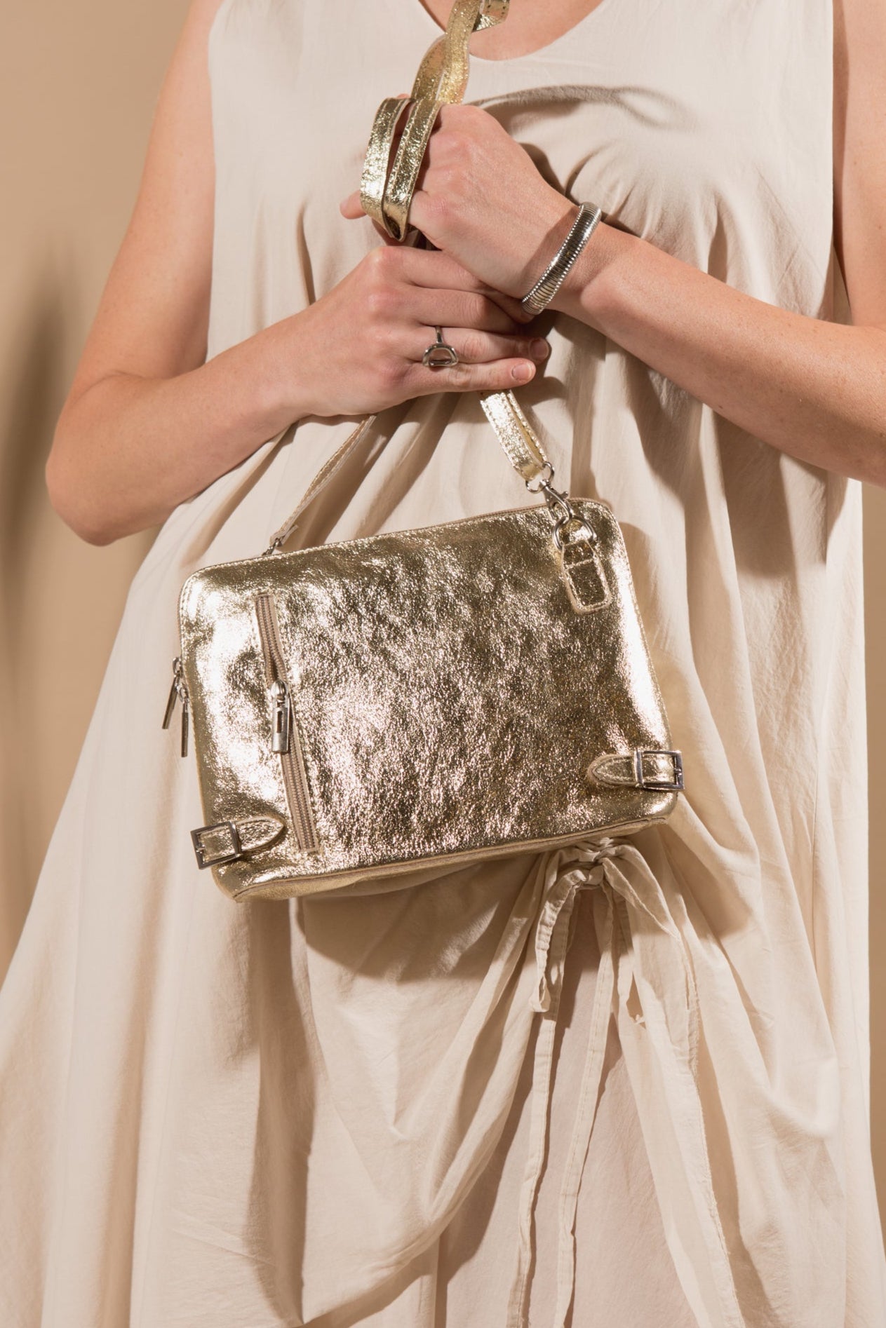 The Sloane Leather Handbag is an elegant choice for a compact daily companion or a stylish travel accessory. It features an adjustable crossbody strap and distinctive buckle accents on both sides. Inside, you'll find a side open pocket and a central zipped compartment, complemented by zipped pockets on the front and back. The bag secures with a zip that extends fully around the sides. Crafted from 100% Italian leather, it combines refined design with practical functionality.