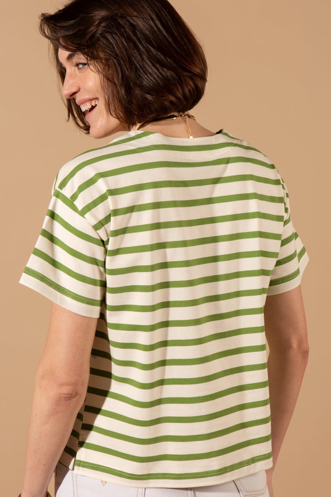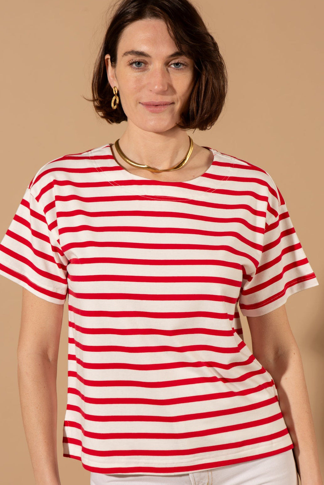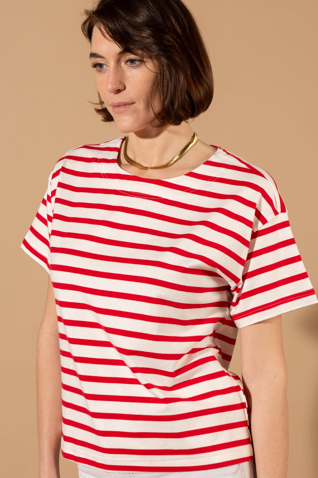 The Boxy Striped T-Shirt features a classic round neckline, short sleeves with dropped shoulders for a relaxed feel, and an all-over horizontal striped pattern in a structured, boxy-fit silhouette.