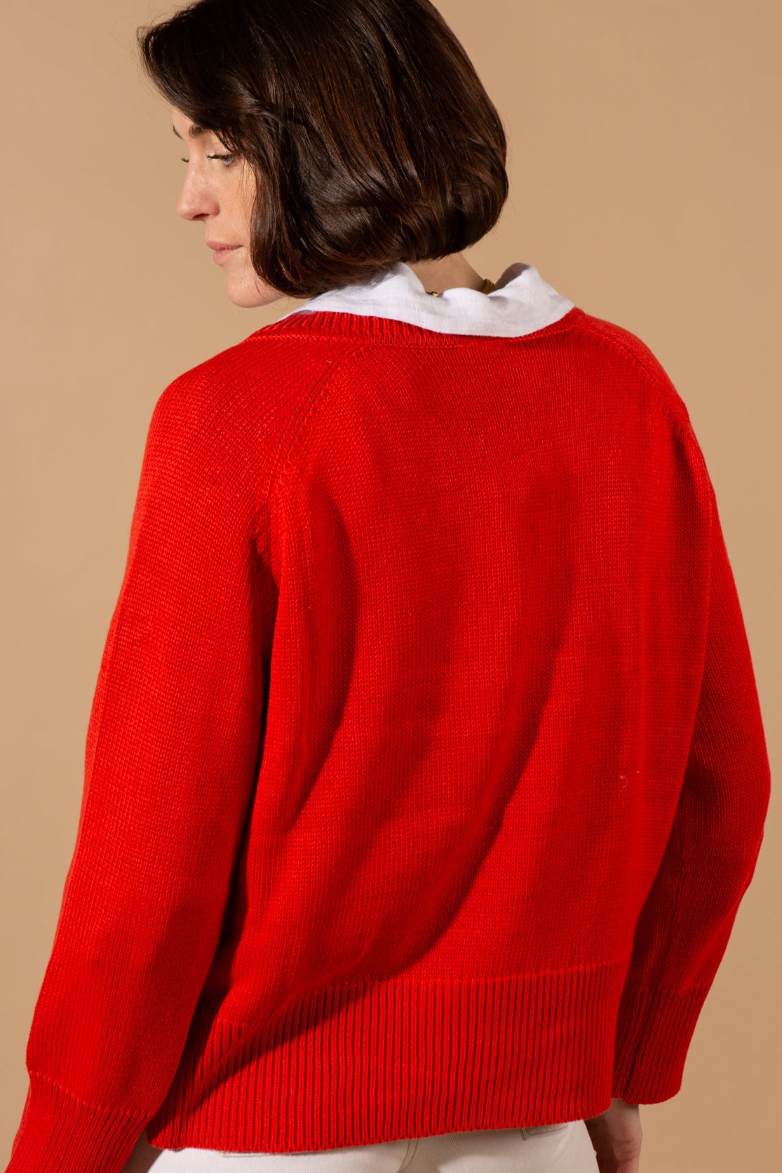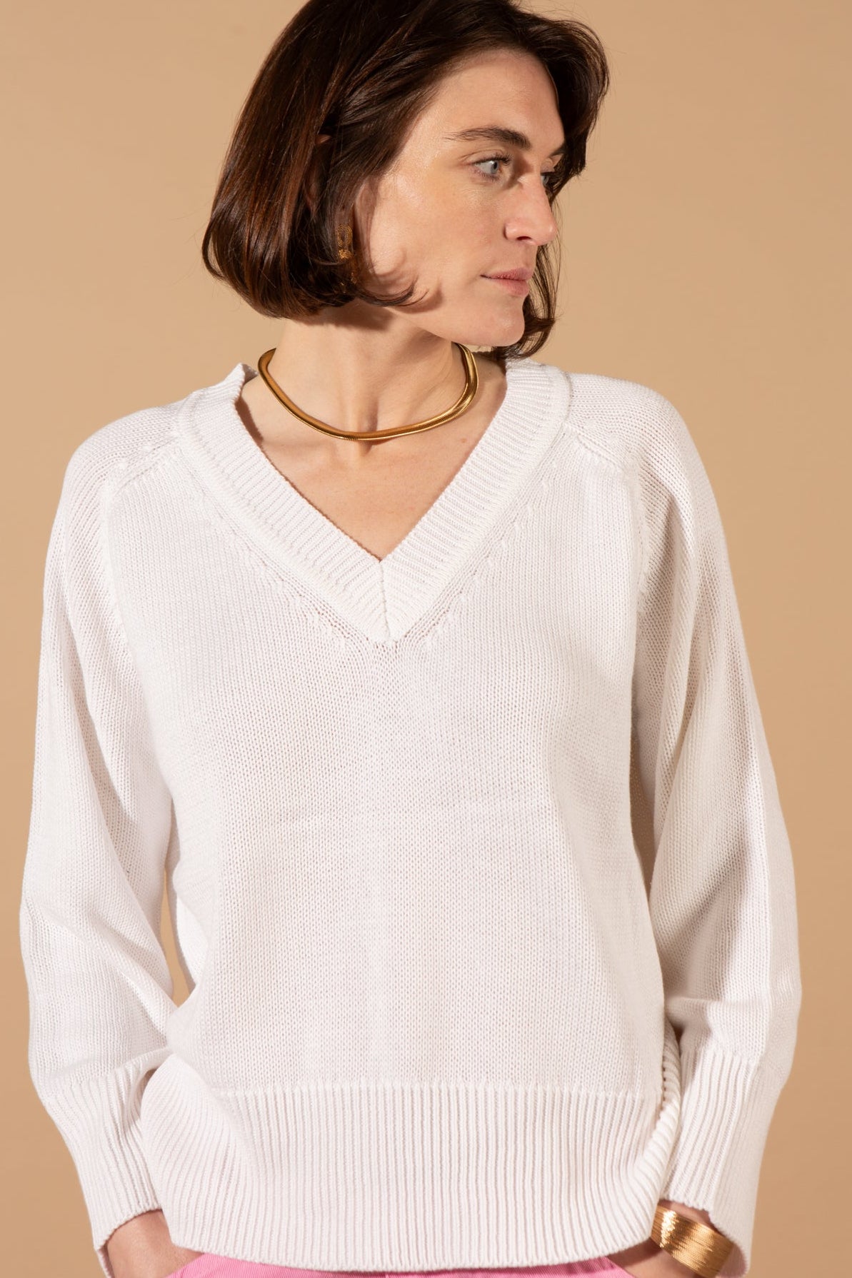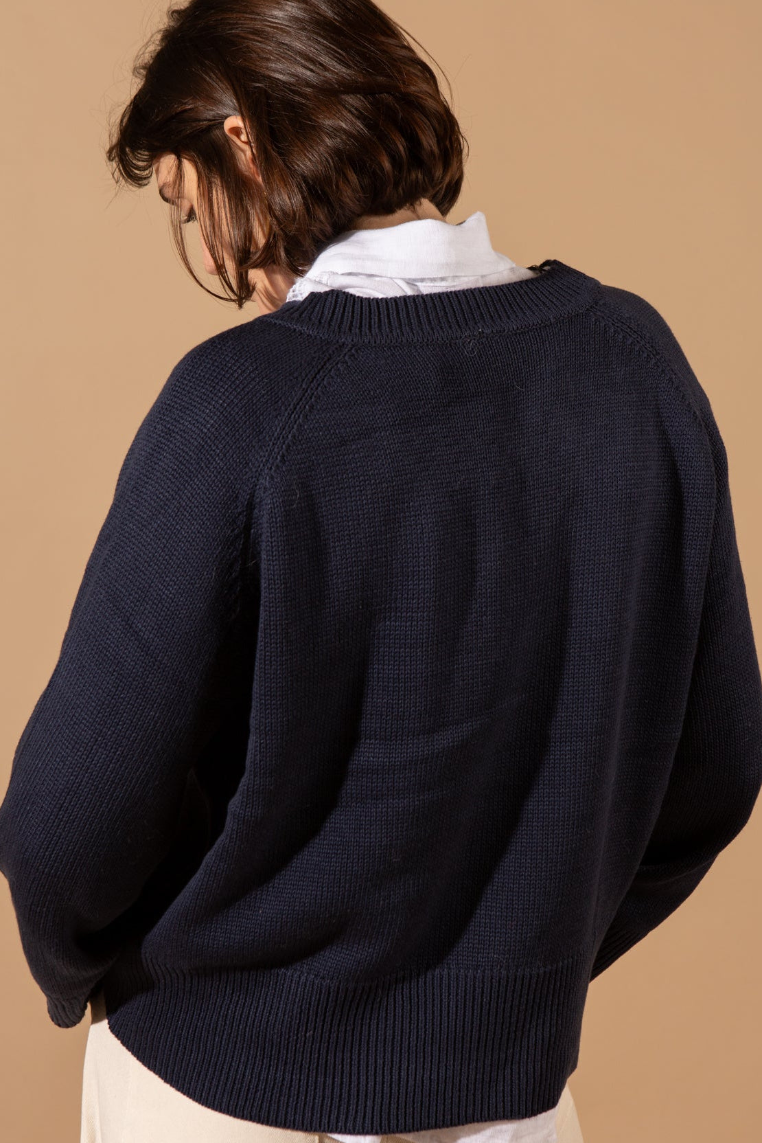 The Cotton Mix V-Neck Jumper features a classic V-neckline, long sleeves with a slightly slouchy silhouette, and ribbed detailing at the cuffs and hem, crafted in a soft and breathable cotton-blend knit.