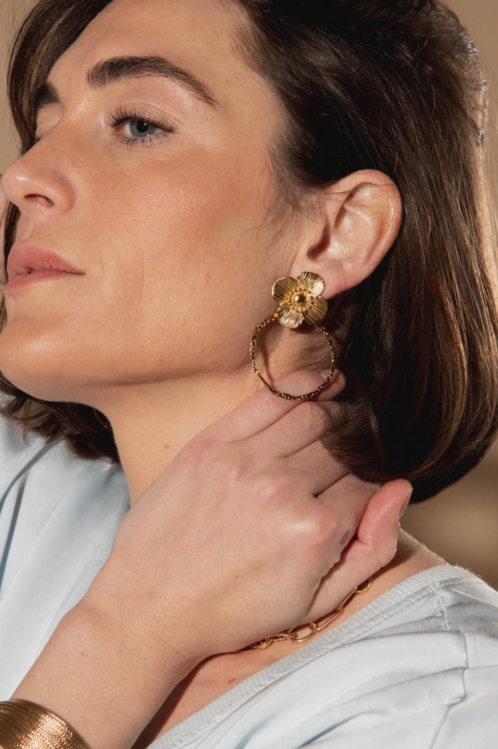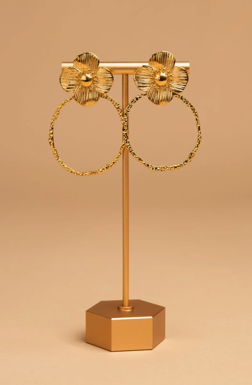 Gold-tone flower stud earrings with textured hoop drops. A bold statement piece with standout detail.