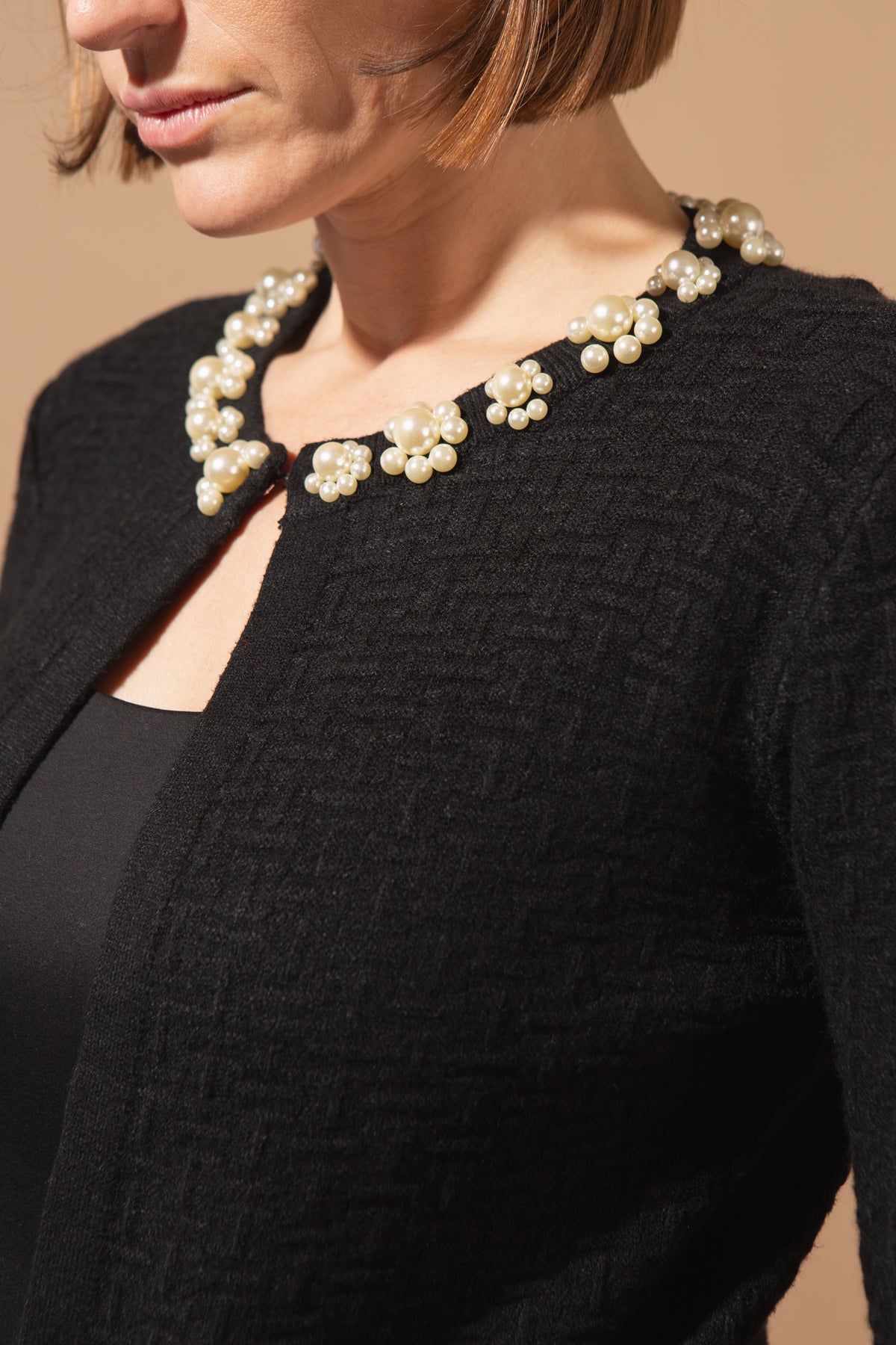 Introduce a touch of timeless sophistication to your wardrobe with the Faux Pearl Detail Cardigan. This beautiful knitwear piece elevates the traditional cardigan silhouette with a delicate, handcrafted collar featuring stunning faux pearl embellishments. With its cropped, elegant fit and textured knit, it offers comfortable warmth while providing a polished, high-end aesthetic perfect for special occasions or smart-casual styling.