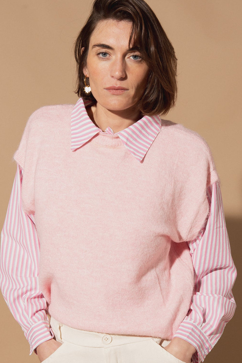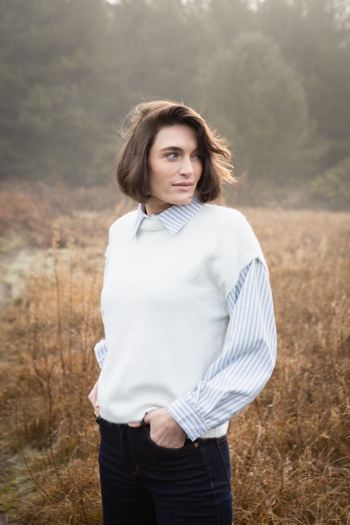 Achieve the perfectly layered look without any of the added bulk with our Mock Shirt Sweater Vest. Combining the cosy texture of a knit vest with the crisp polish of a classic button-down, this piece is your shortcut to an effortless, preppy-chic aesthetic.