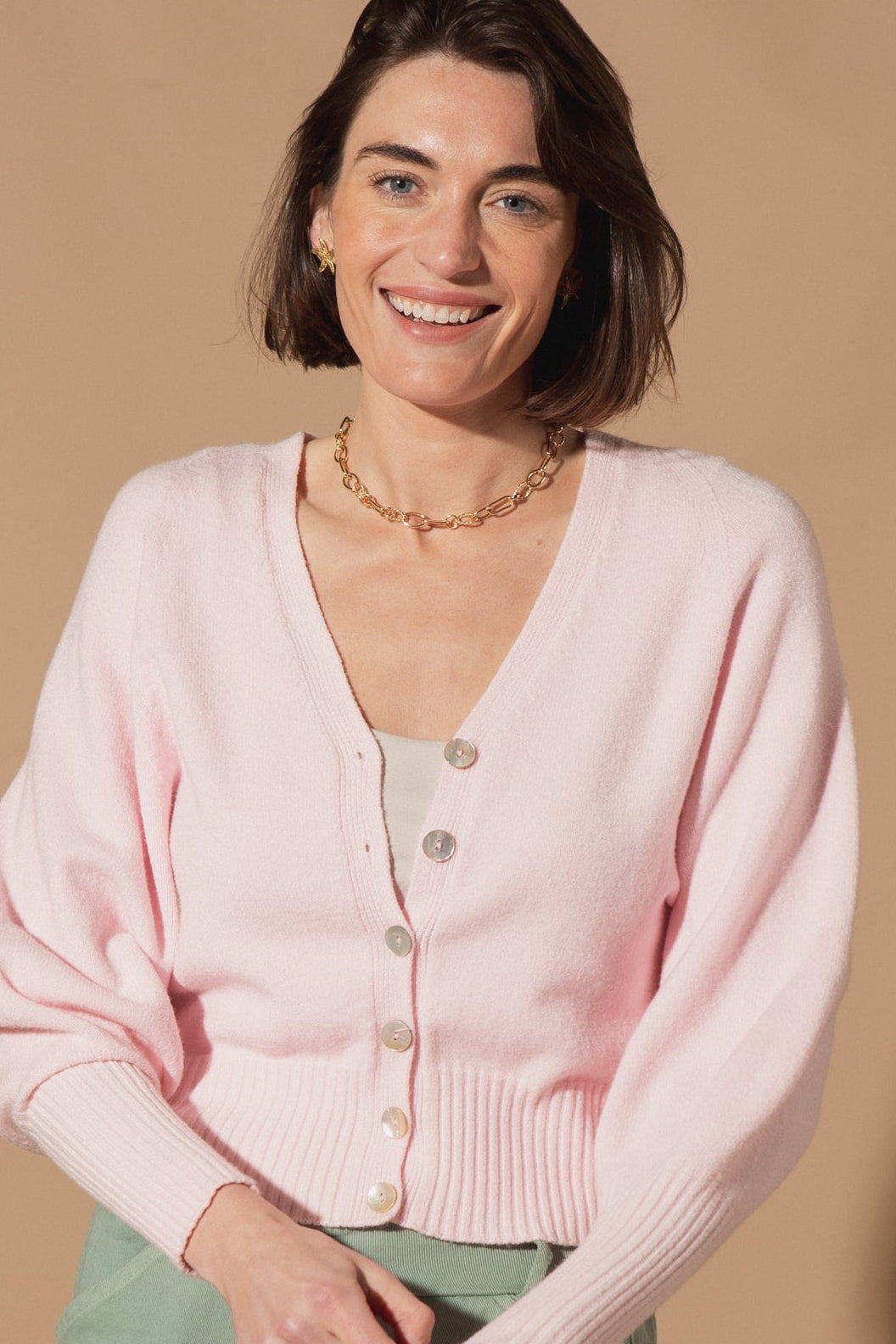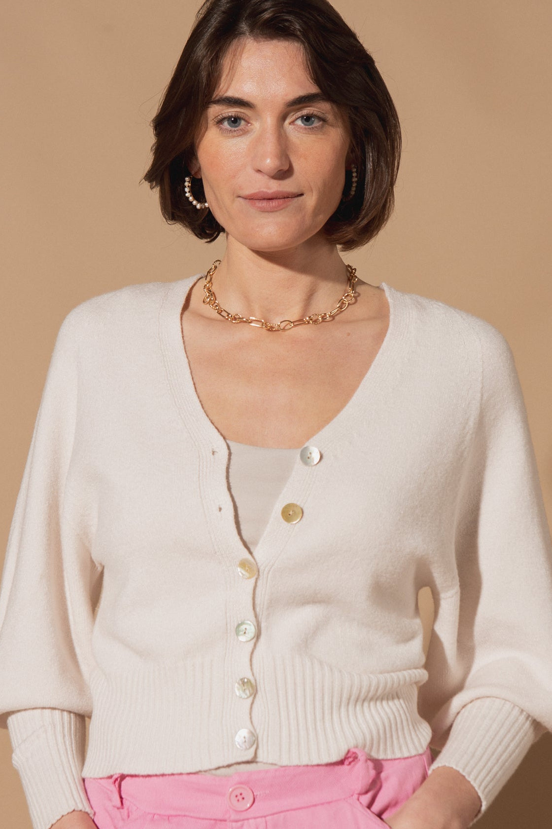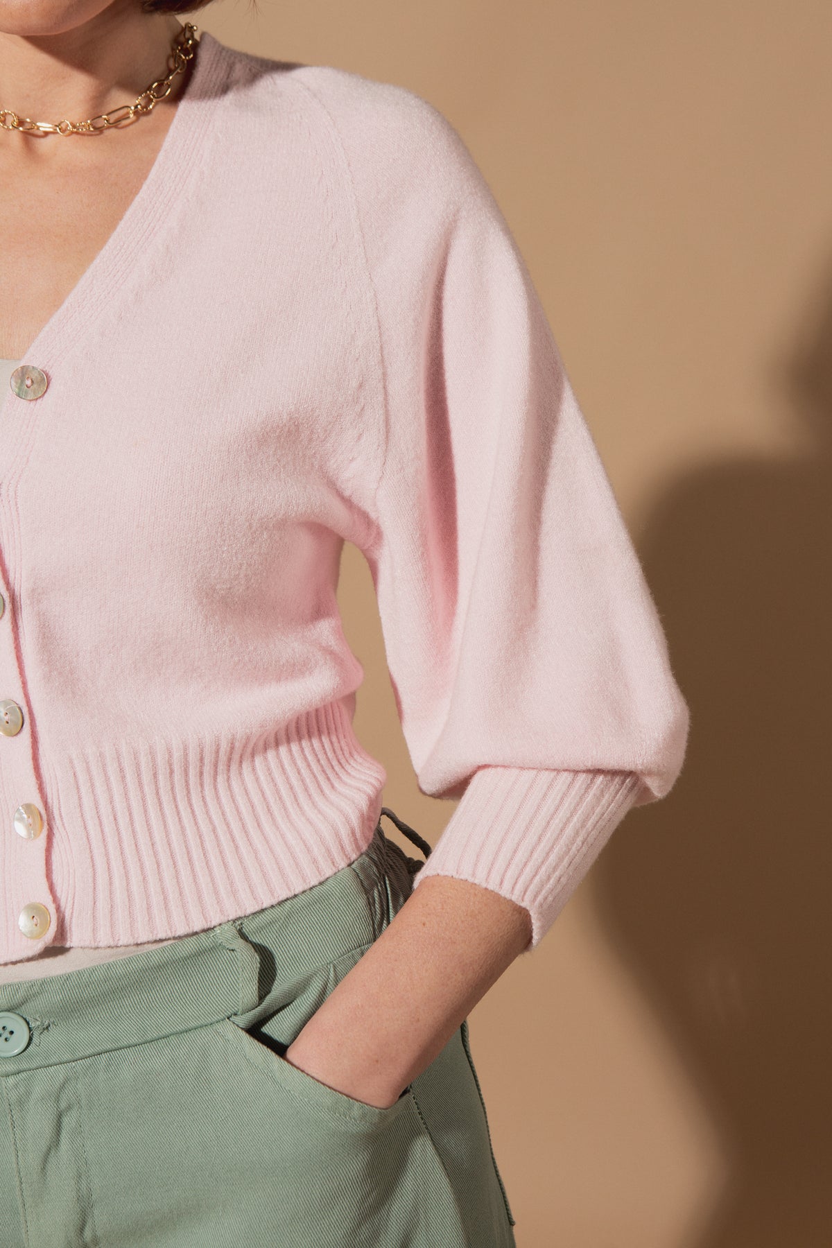 Designed with a flattering V-neckline and a button-down front, this cardigan features stunning 3/4 length balloon sleeves that add just the right amount of volume and drama. The wide ribbed hem and cuffs create a structured, slightly cropped fit that sits perfectly at the waist.