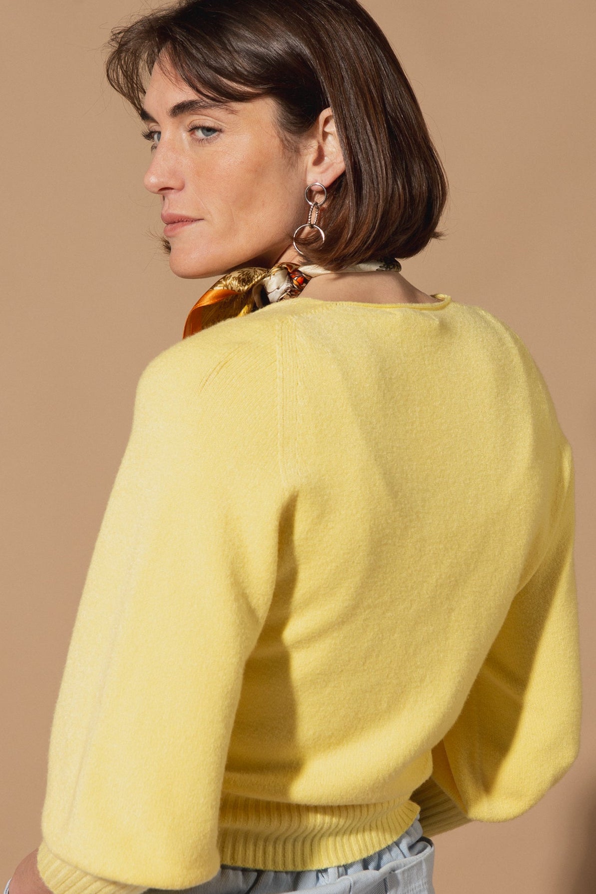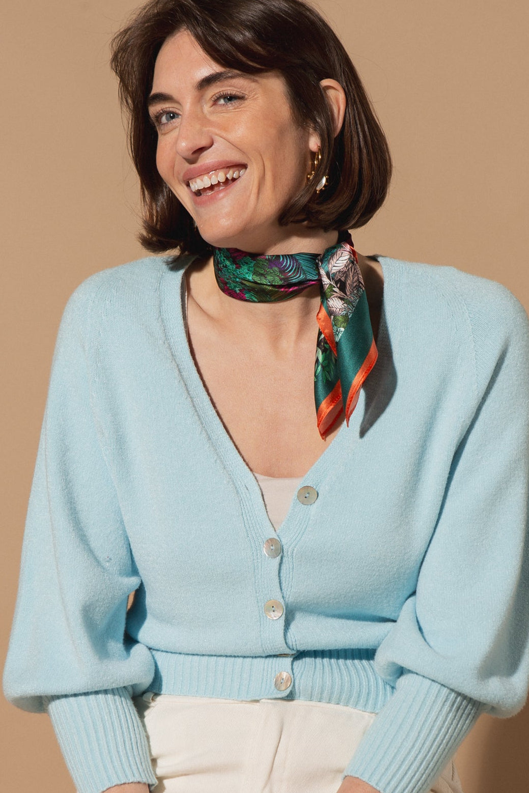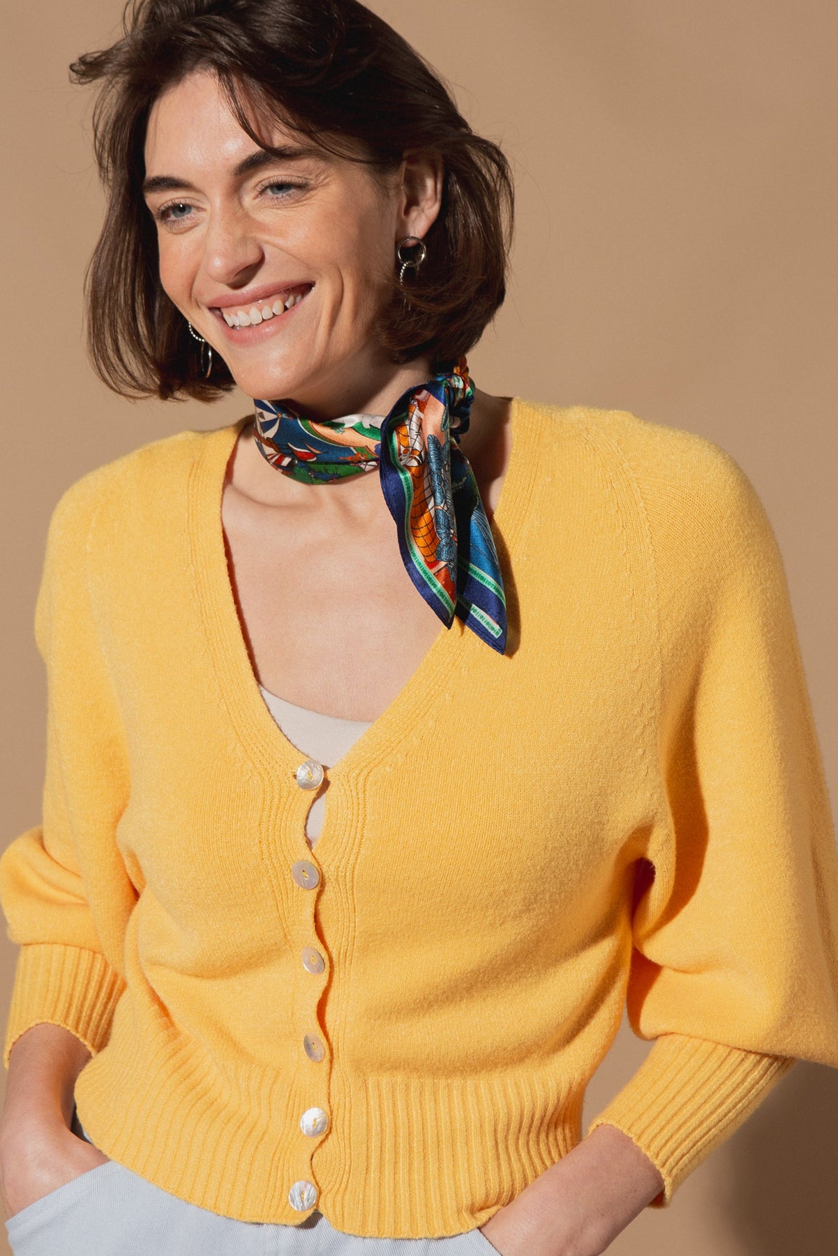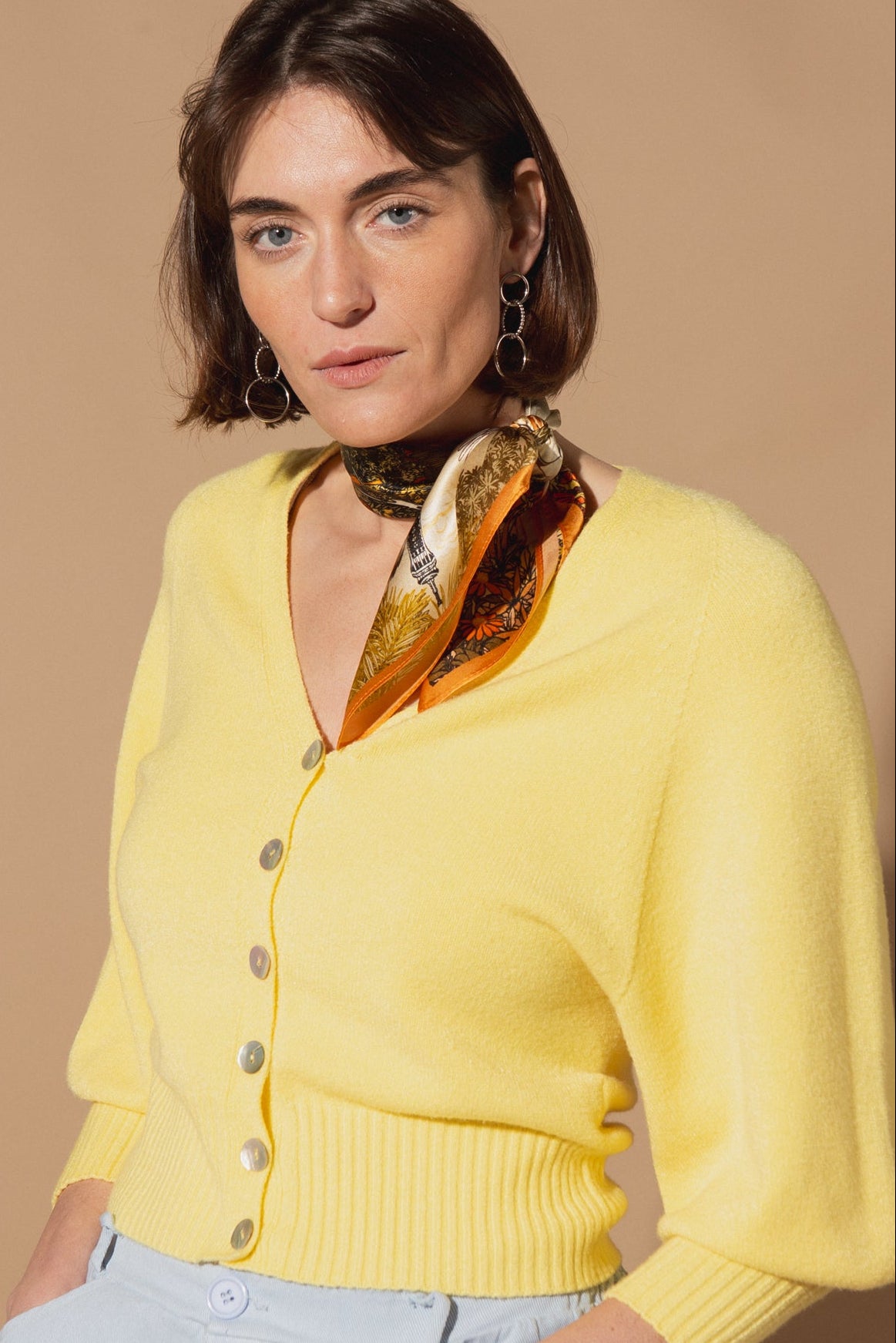 Designed with a flattering V-neckline and a button-down front, this cardigan features stunning 3/4 length balloon sleeves that add just the right amount of volume and drama. The wide ribbed hem and cuffs create a structured, slightly cropped fit that sits perfectly at the waist.