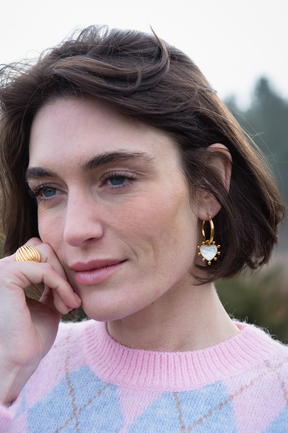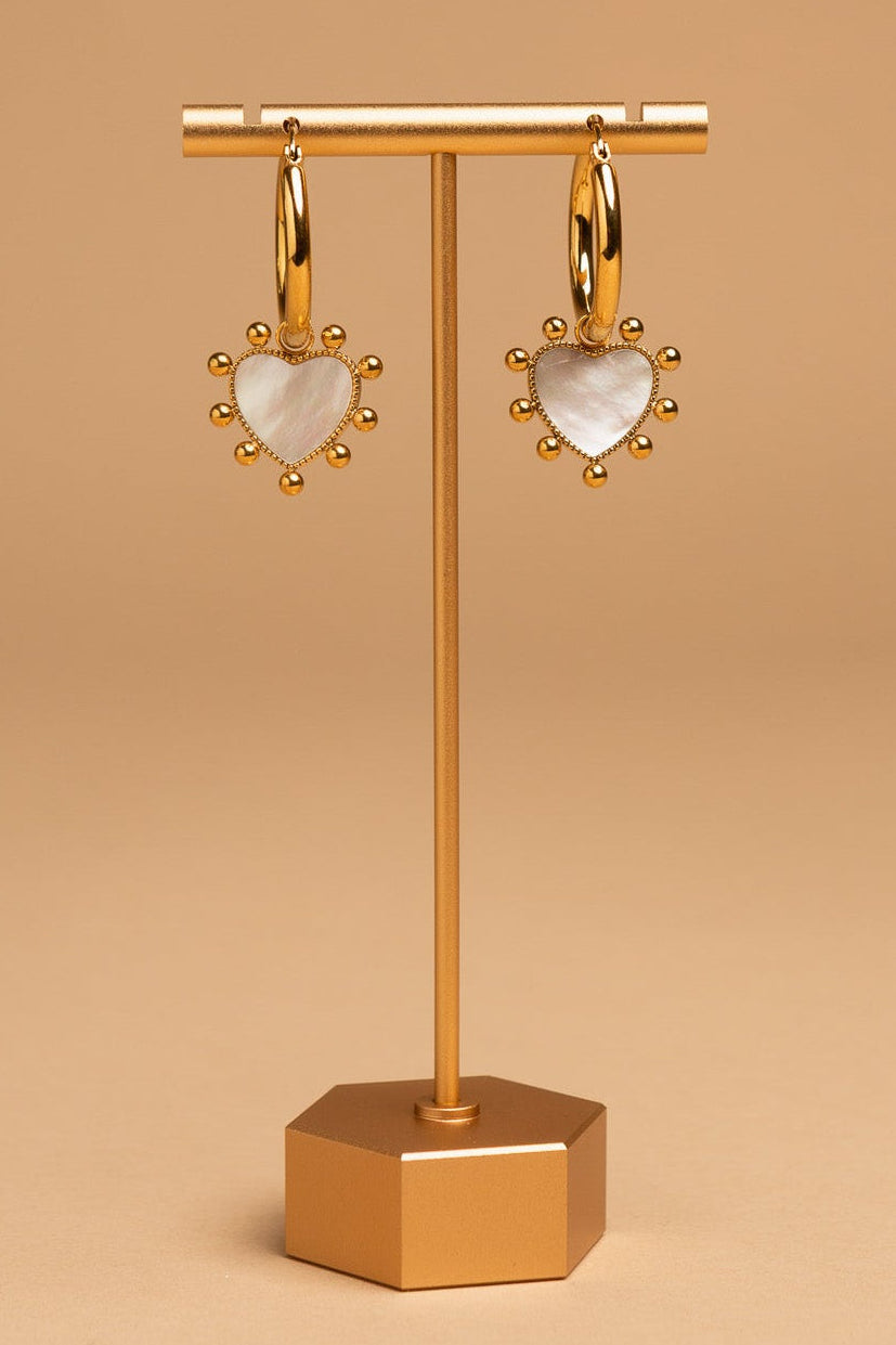 Polished gold-tone hoops with pearl heart drops. A modern, feminine update on a classic hoop.