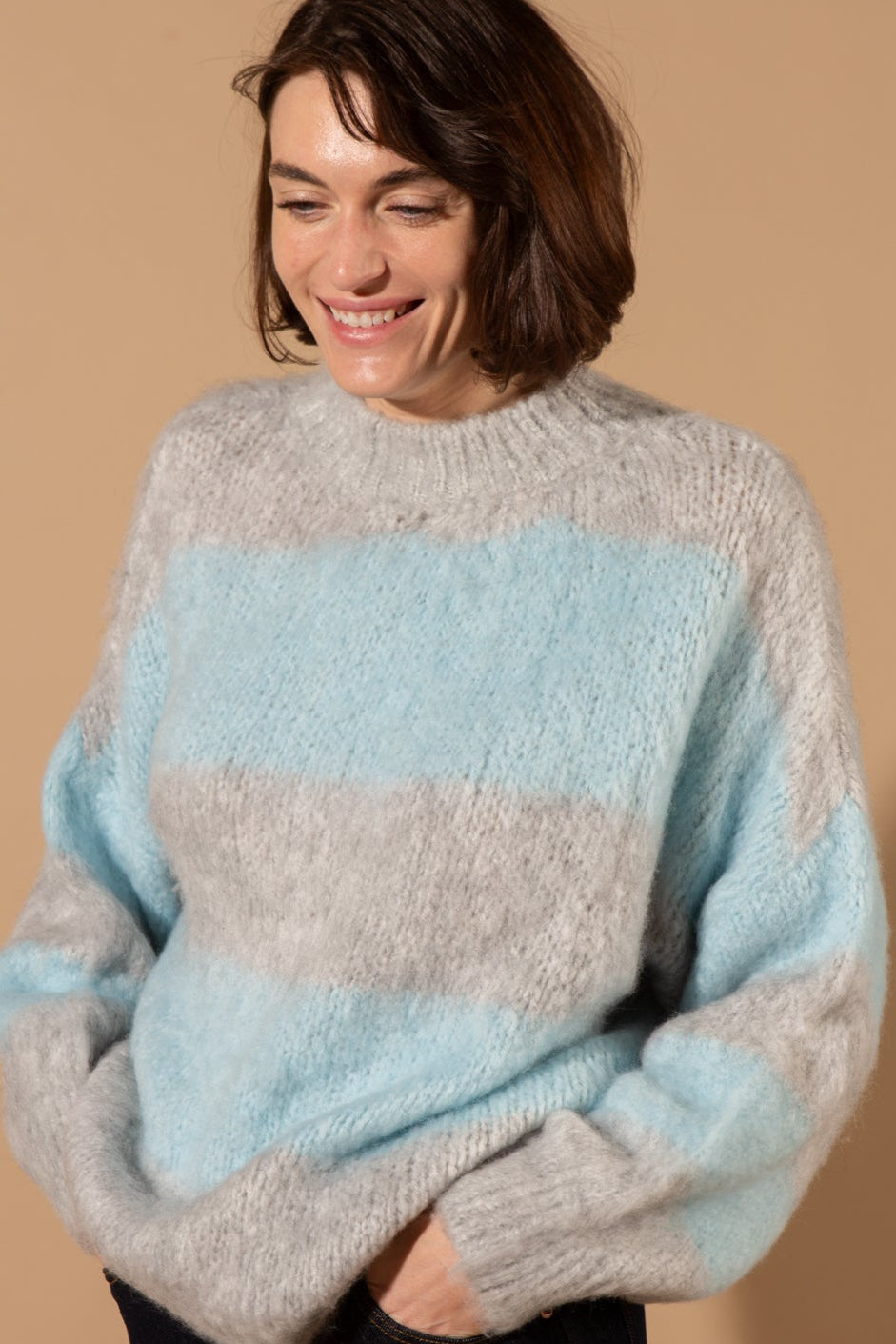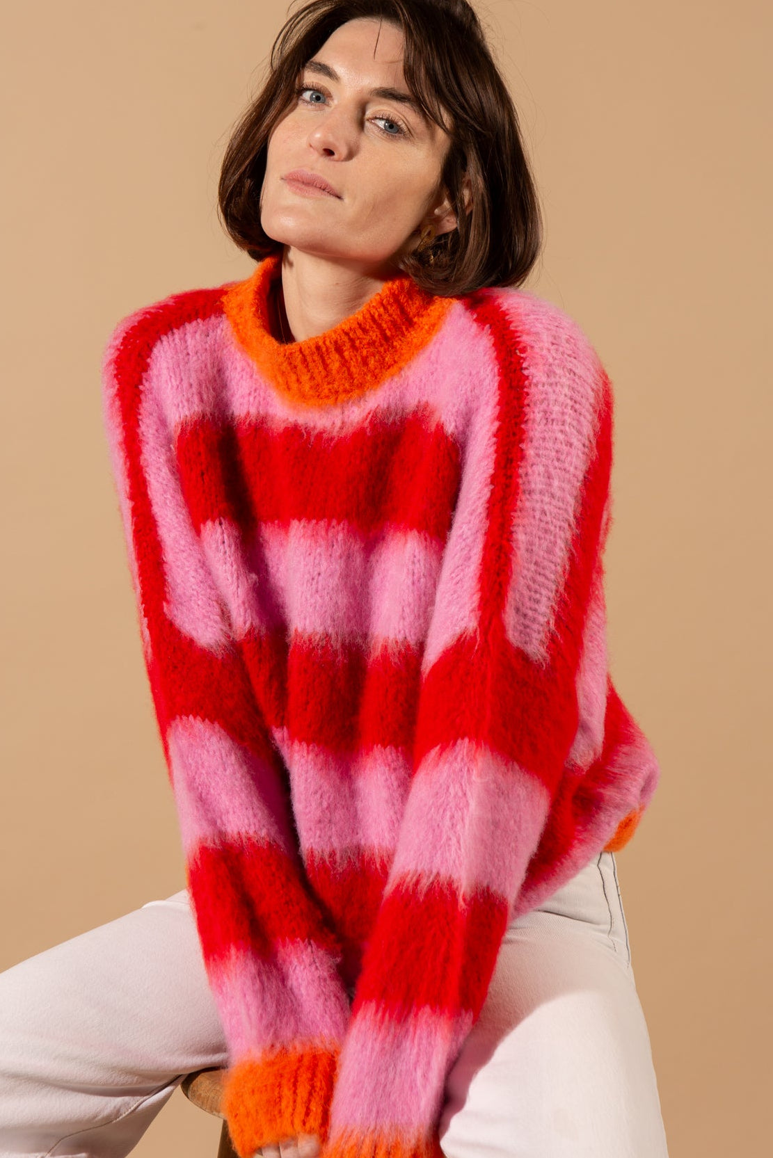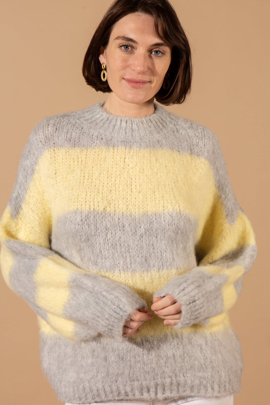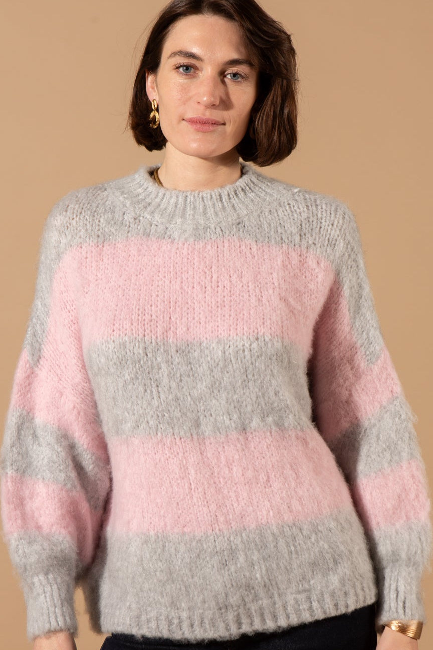 The Wool Blend Striped Jumper features a classic crew neckline, long sleeves with dropped shoulders, and a bold horizontal striped pattern, crafted in a thick, textured wool-blend knit for ultimate warmth