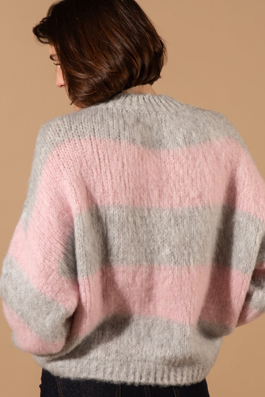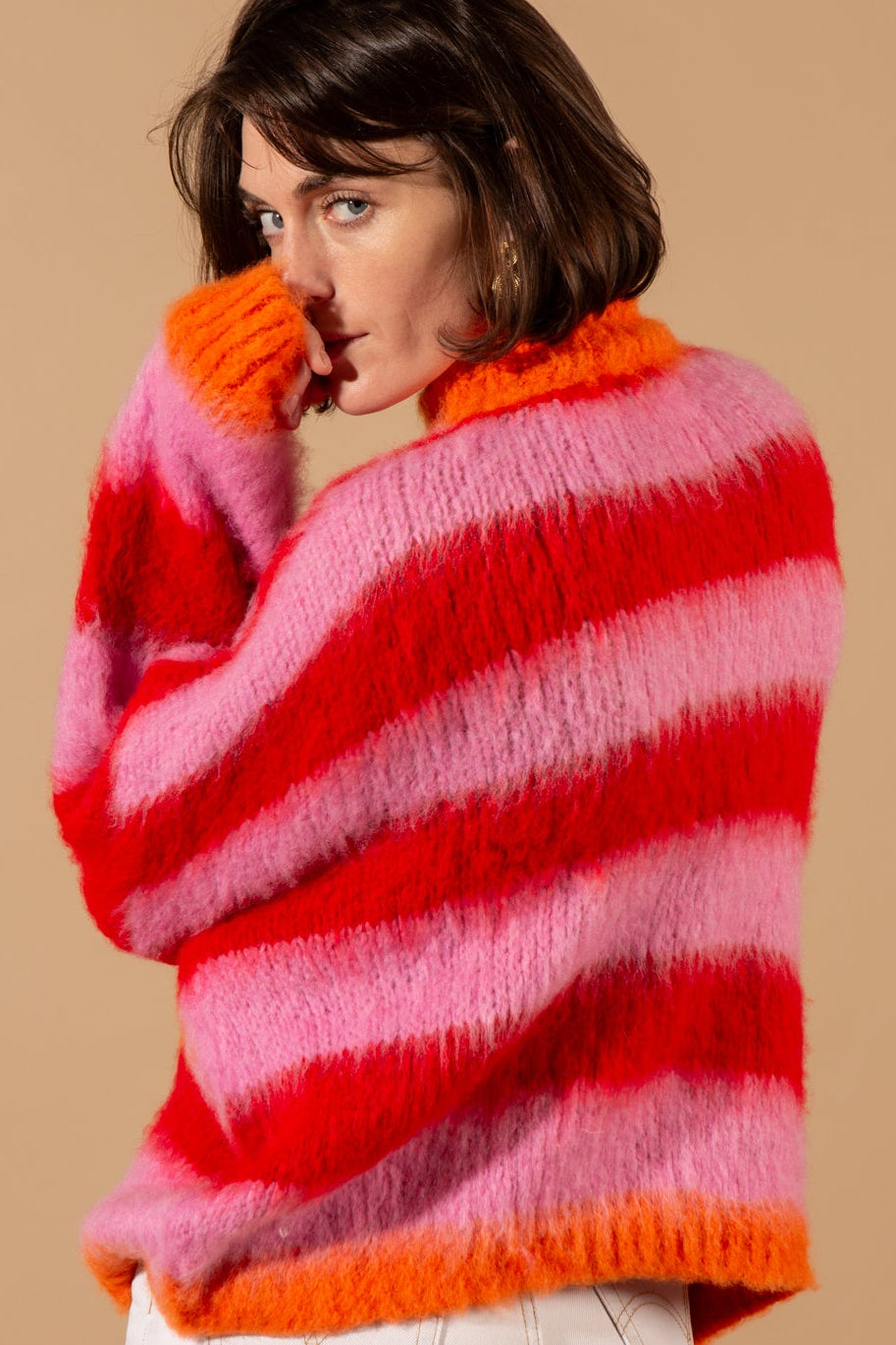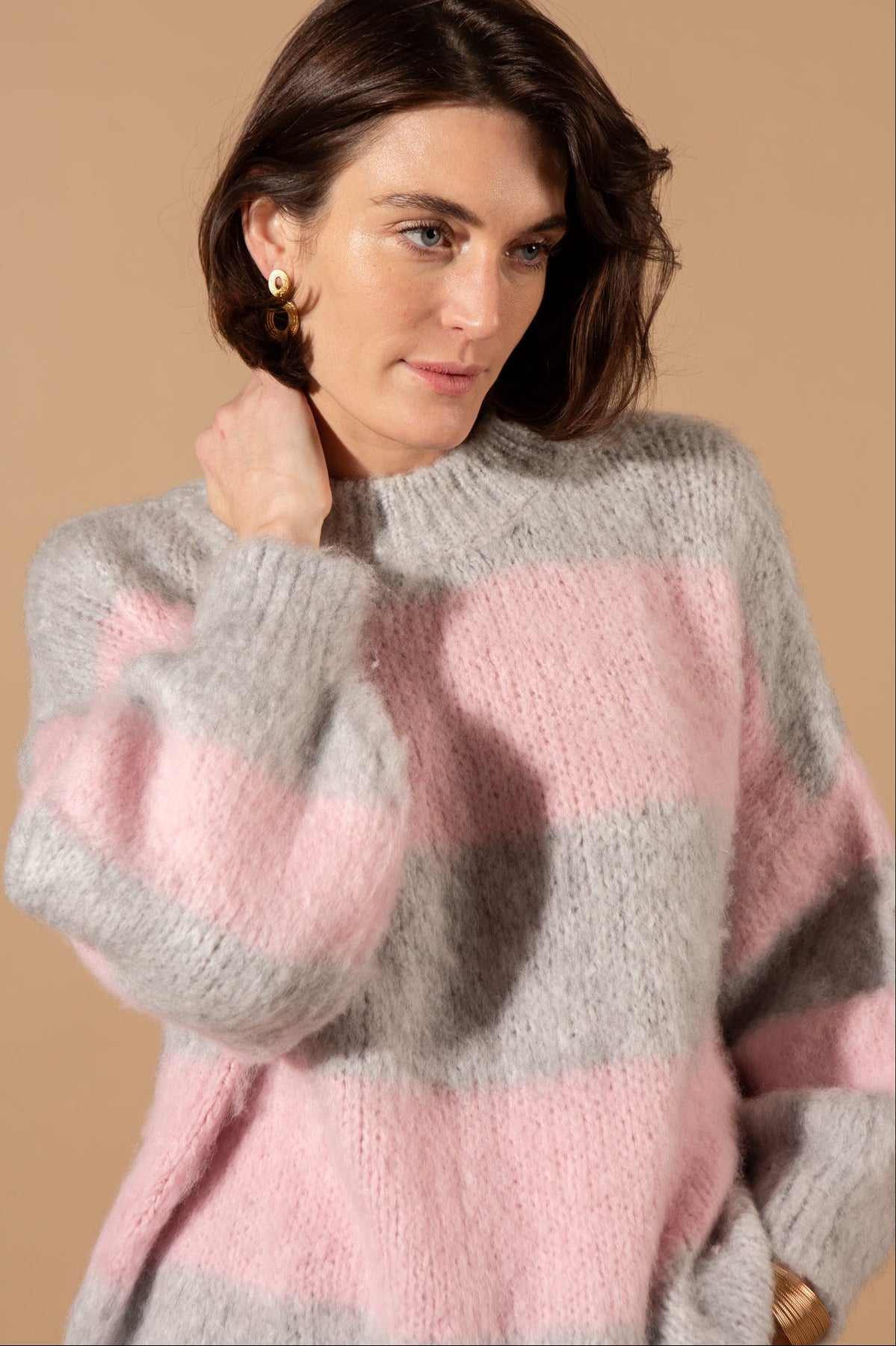 The Wool Blend Striped Jumper features a classic crew neckline, long sleeves with dropped shoulders, and a bold horizontal striped pattern, crafted in a thick, textured wool-blend knit for ultimate warmth