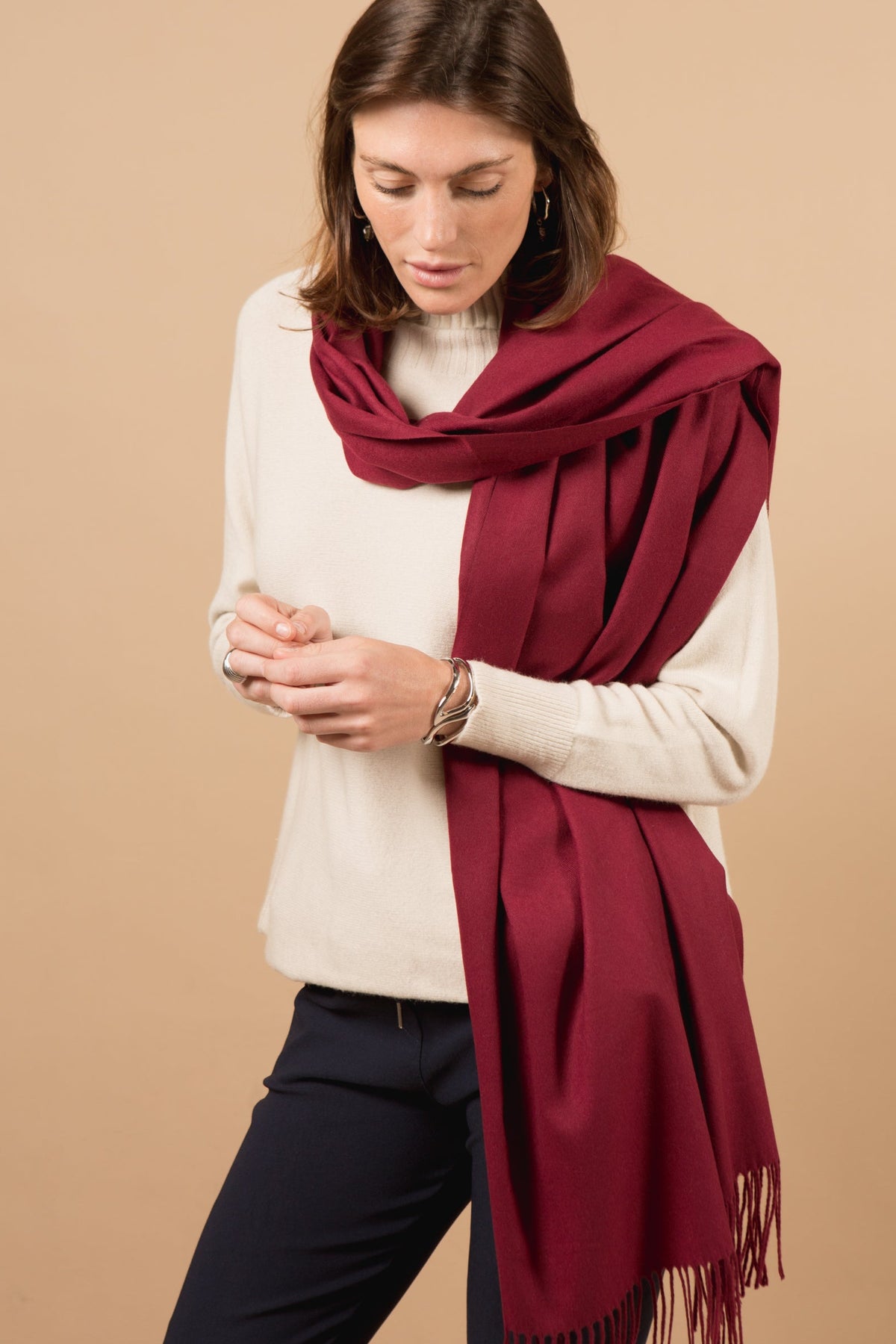 The Cashmere-Mix Pashmina remains a favourite at Tilley & Grace, available in an elegant selection of colours. It features delicately twisted tassels on each end and drapes gracefully around the neck. Ideal as a shawl or casually draped over the shoulders, this versatile scarf offers numerous styling options. Its luxurious softness makes it suitable for year-round wear, combining comfort with timeless sophistication.
