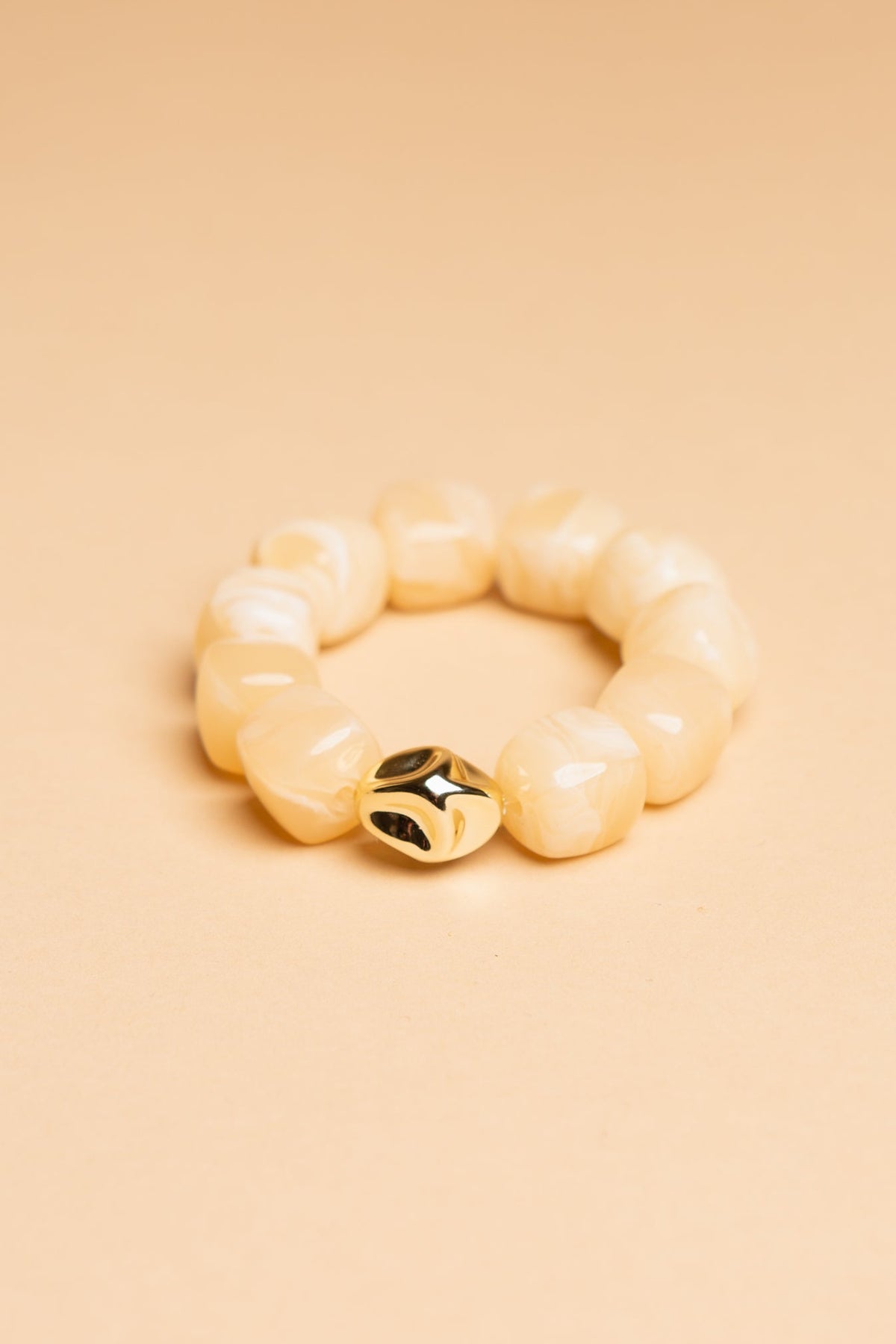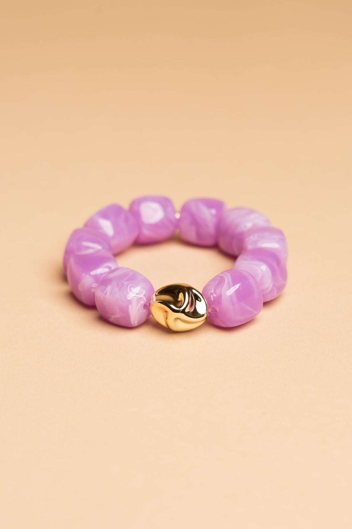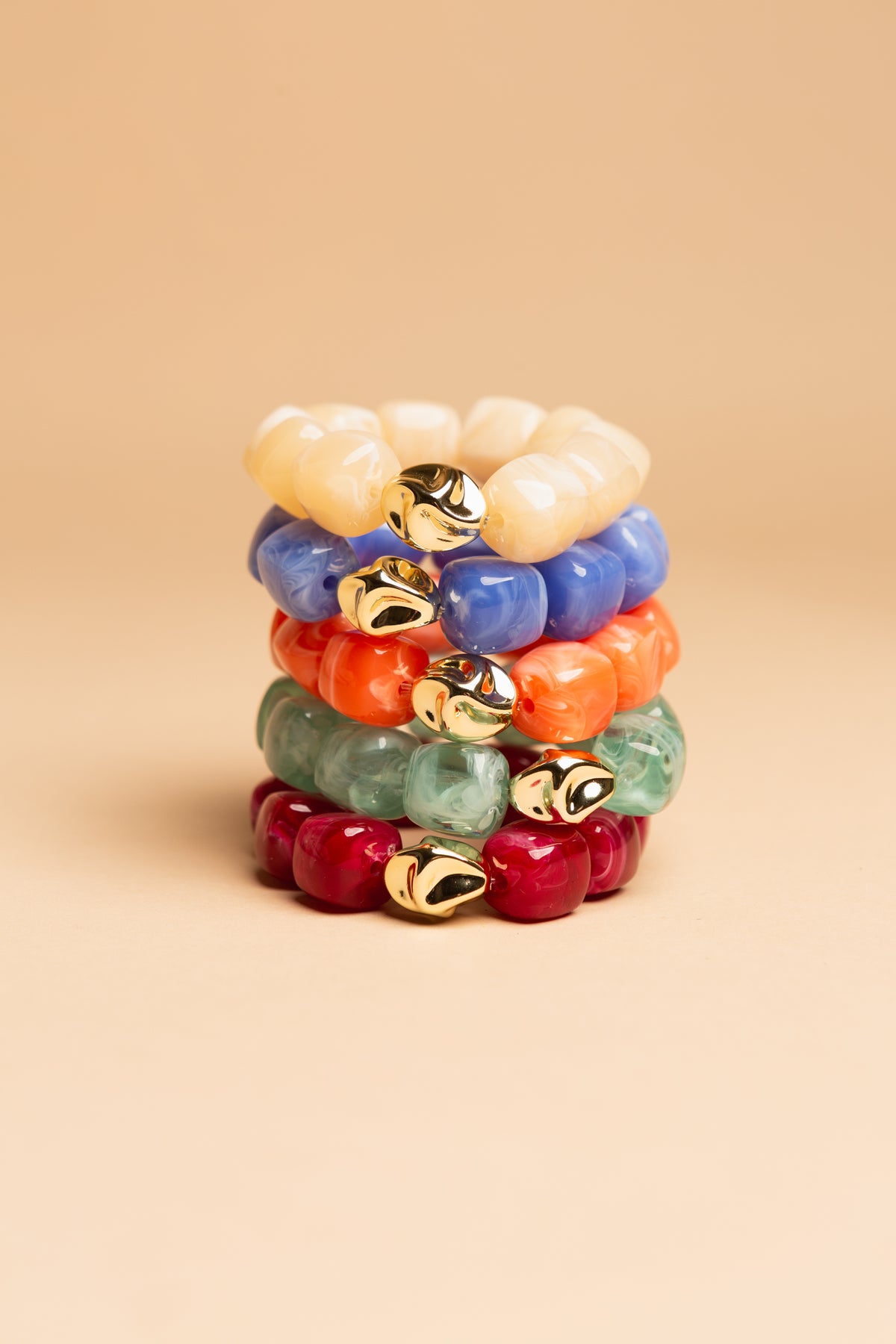 Each bracelet features chunky, smooth resin beads with a stunning marbled finish, centered by a single, sculptural gold-toned statement bead.