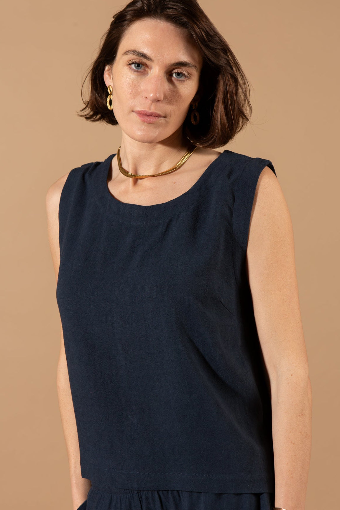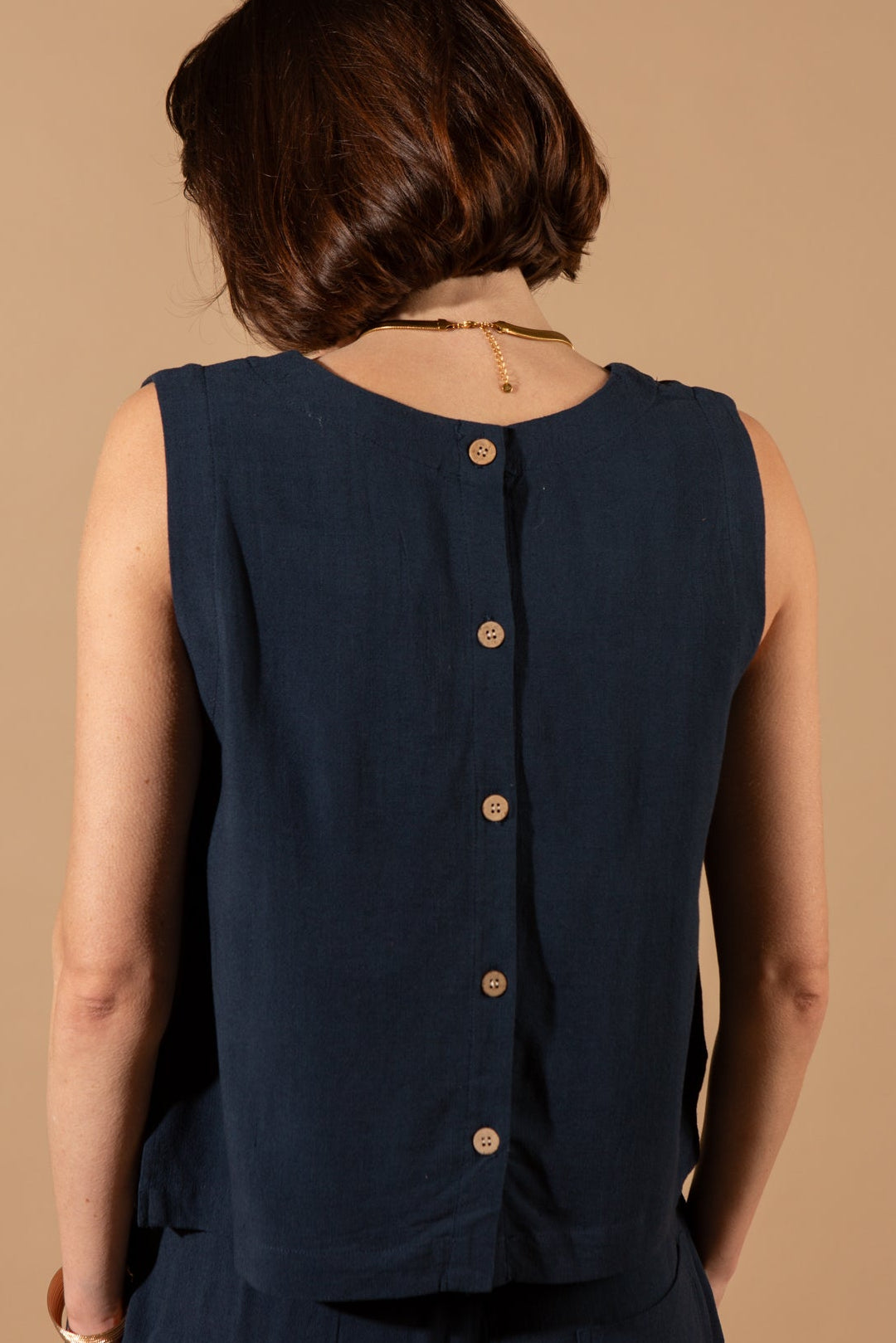 The Linen Mix Button Back Vest features a sophisticated round neckline, a sleeveless silhouette, and a unique functional button-down back with contrasting buttons, crafted in a lightweight and breathable linen-blend fabric.