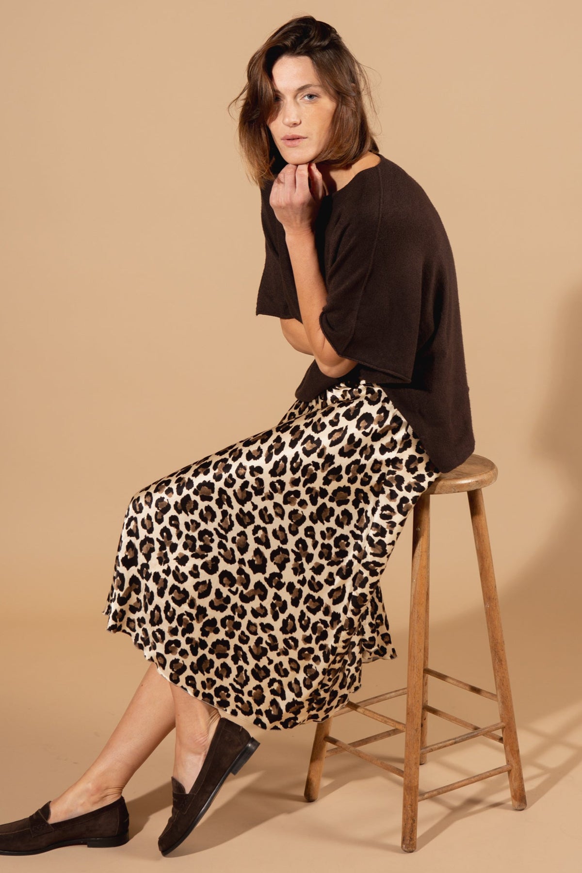 The Leopard Satin Skirt is the statement piece that pairs with everything. The iconic leopard print adds a touch of boldness, while the two colour options—a neutral, creamy Champagne and a warm Chocolate—ensure you can find the perfect match for your wardrobe.