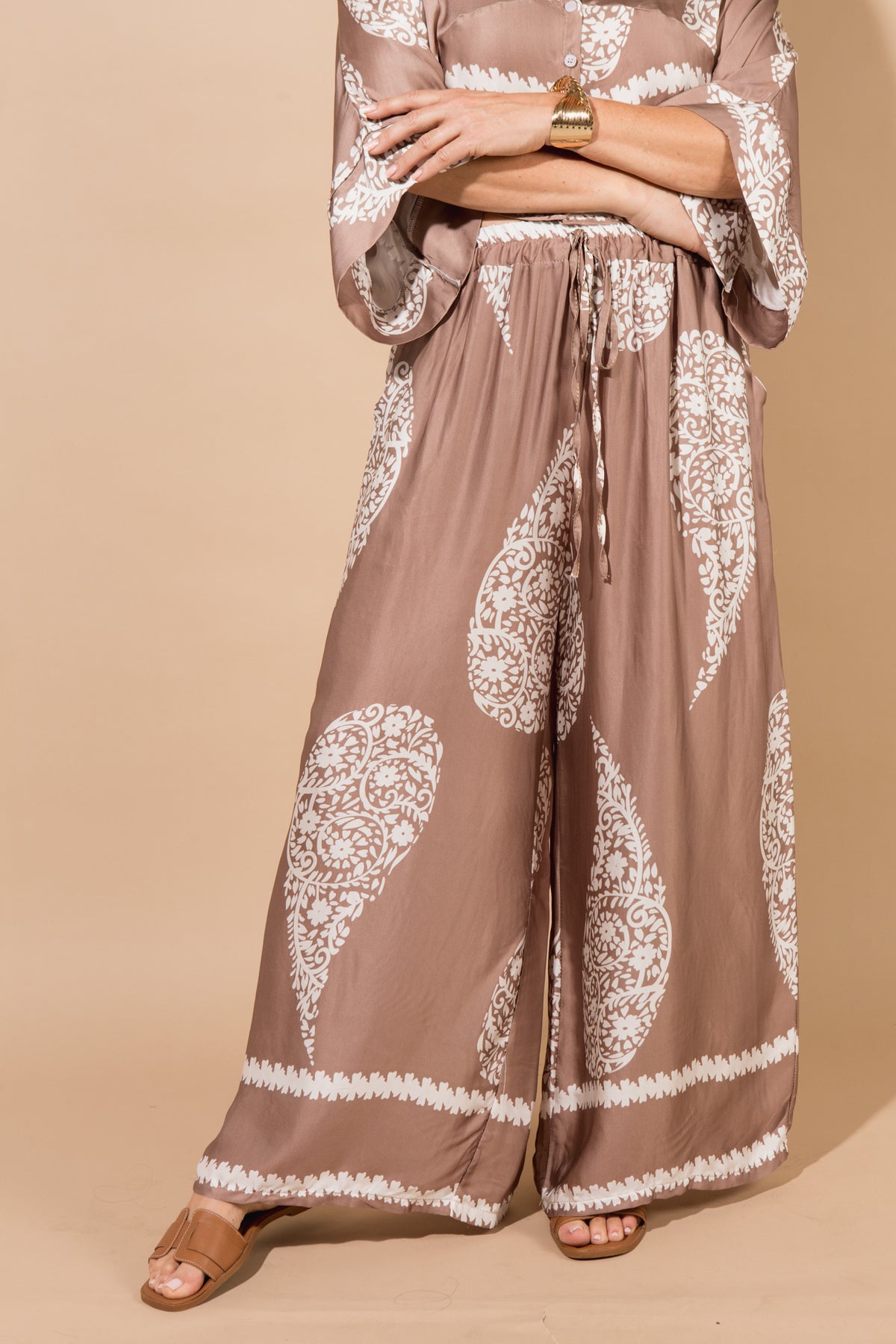 These luxurious, wide-leg trousers are designed for both comfort and style. Crafted from a silky satin fabric, they feature a flowing drape and a unique paisley-style pattern that makes a chic statement. The relaxed fit and practical side pockets make them a perfect choice for all-day wear.