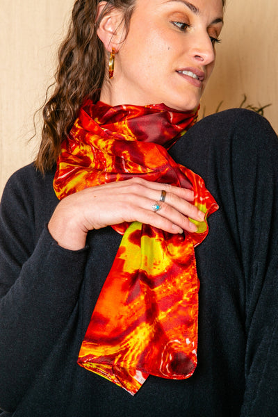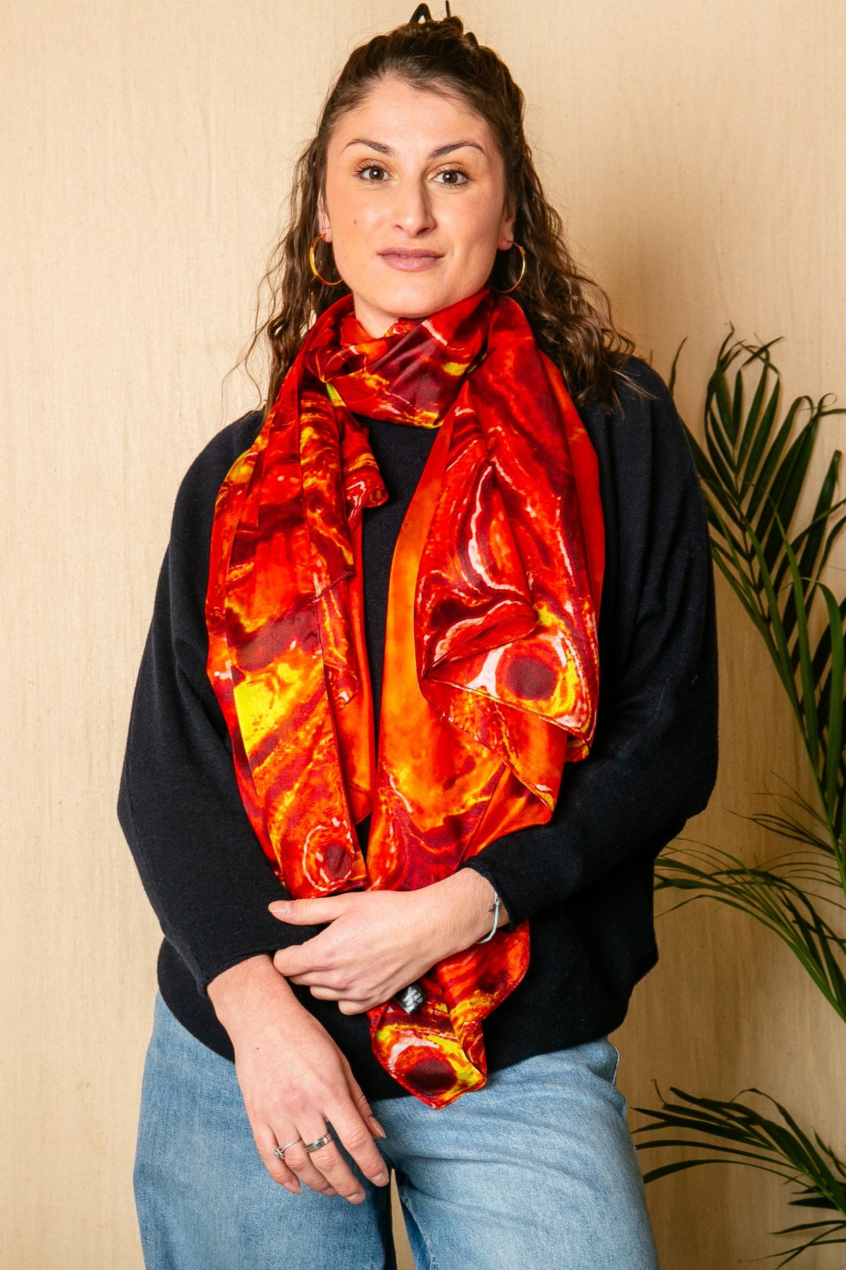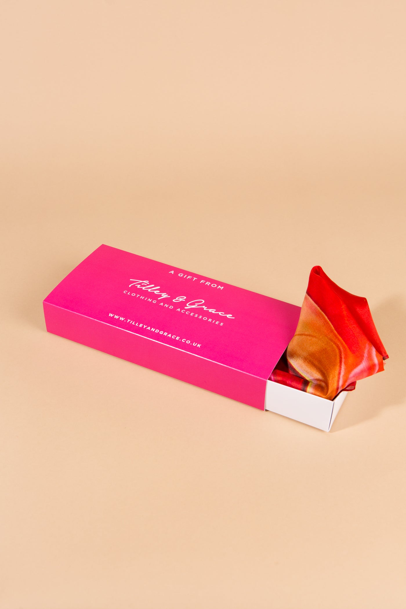 Elevate your ensemble with this Abstract Orange Silk Scarf, crafted from pure silk for a luxurious feel. Its vibrant orange hues and artistic design add a refined splash of color, perfect for enhancing both casual and formal outfits with effortless elegance. Comes wrapped and presented in a Tilley & Grace scarf box.