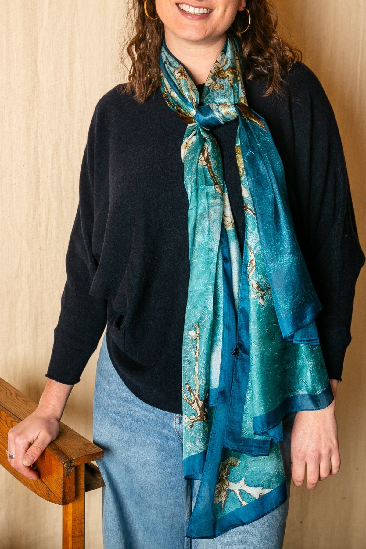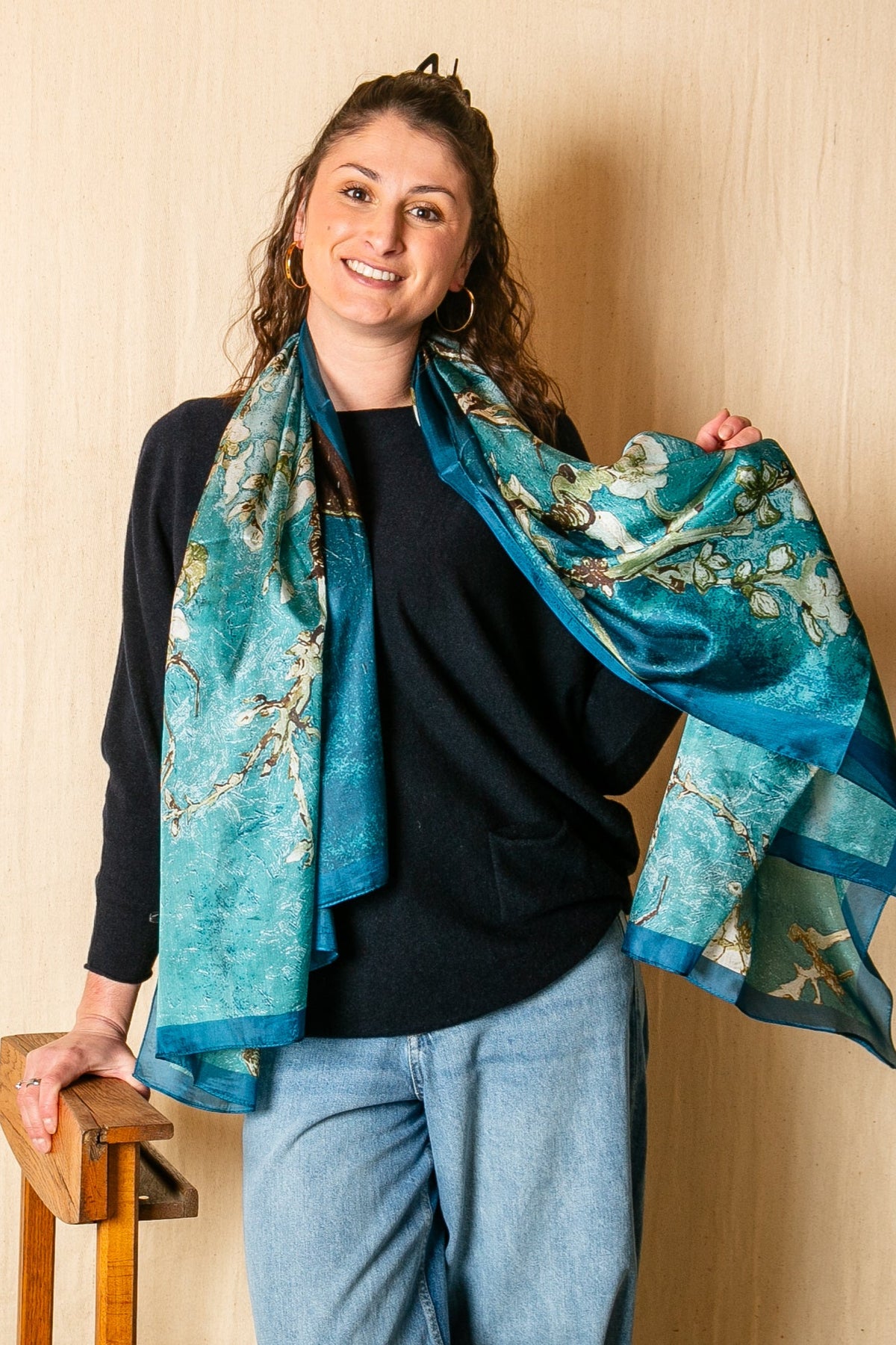 The Spring Bud Teal Silk Scarf showcases elegant silk blue flowers that bring a touch of refined beauty to your wardrobe. Made from premium silk, this scarf offers a smooth texture and graceful drape, perfect for adding a sophisticated accent to any outfit. Comes wrapped and presented in a Tilley & Grace scarf box.